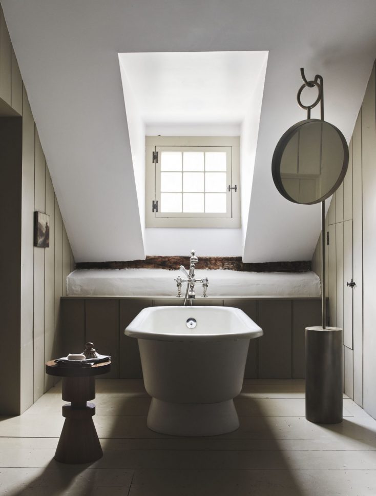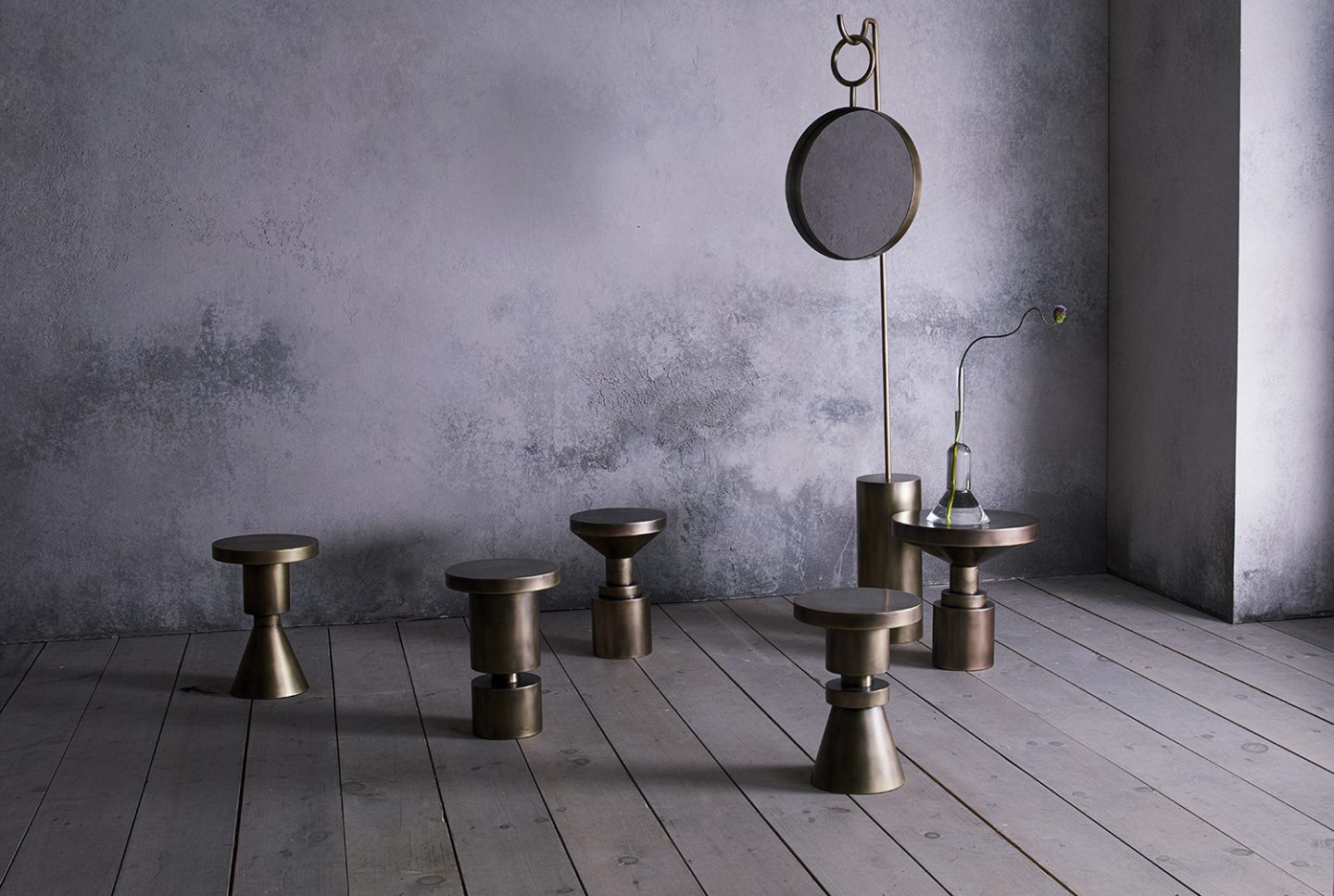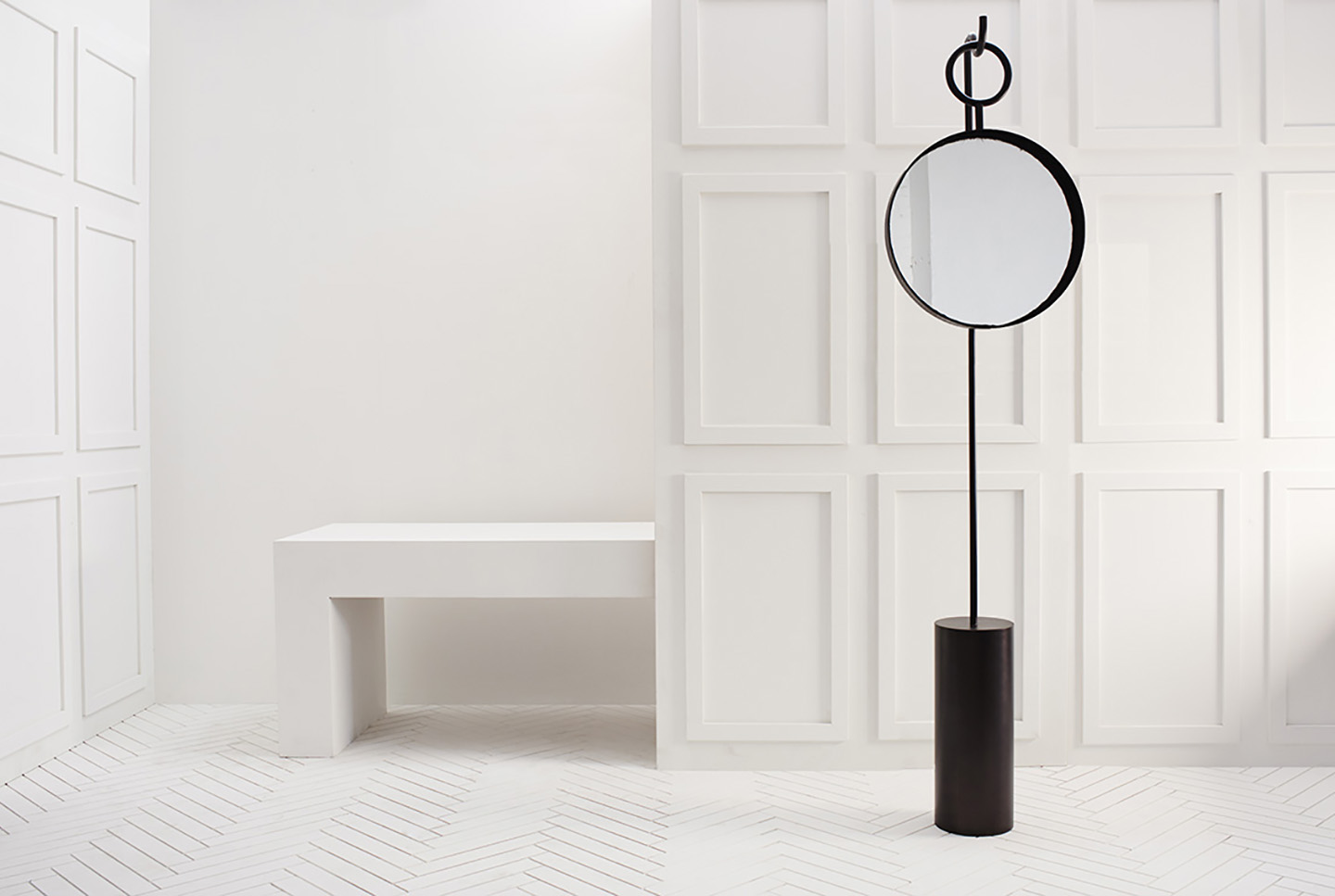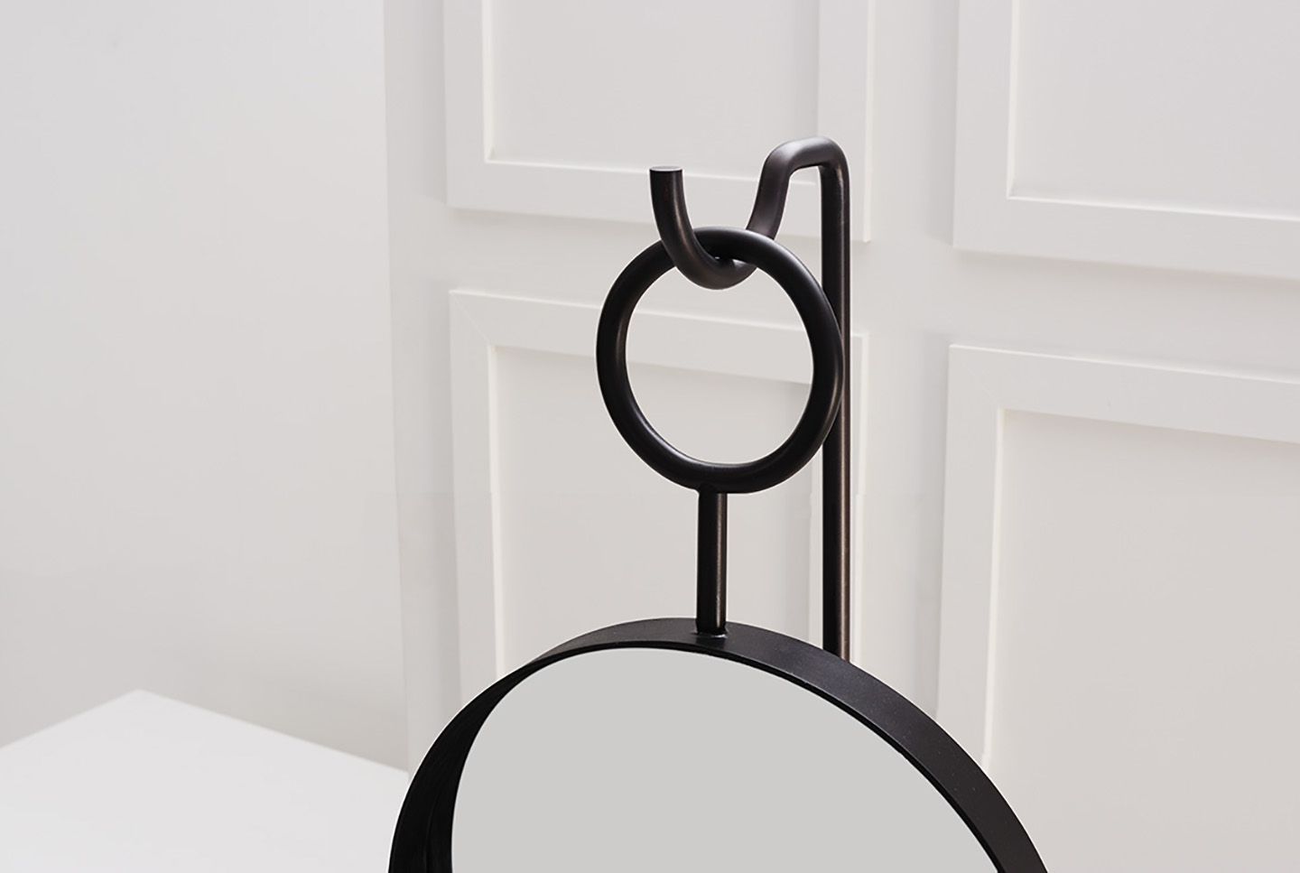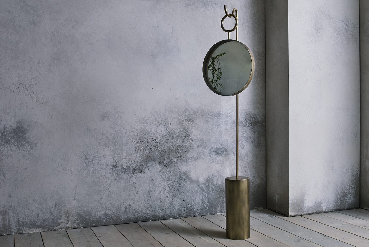 A round mirror, inset deeply in its frame, hangs on a loop from the hook of its accompanying base. This sculptural piece is hand finished in either a rich warm black or antique brass.