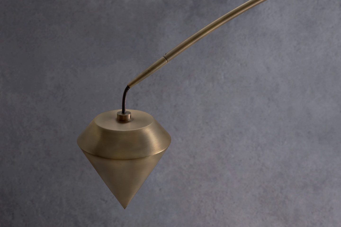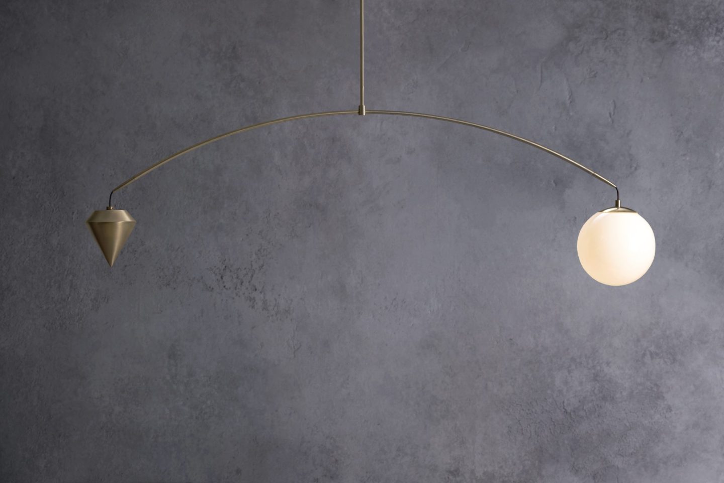 Designed as a light-giving hanging mobile, this sculpture is made from a beautifully tapered arc, balancing a perfect frosted glass orb with our brass plumb weight.