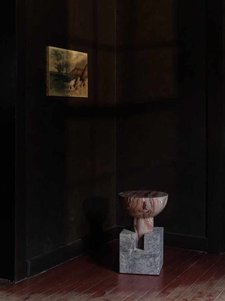 Interlocking shapes in contrasting colors of marble make up this sculptural side table.