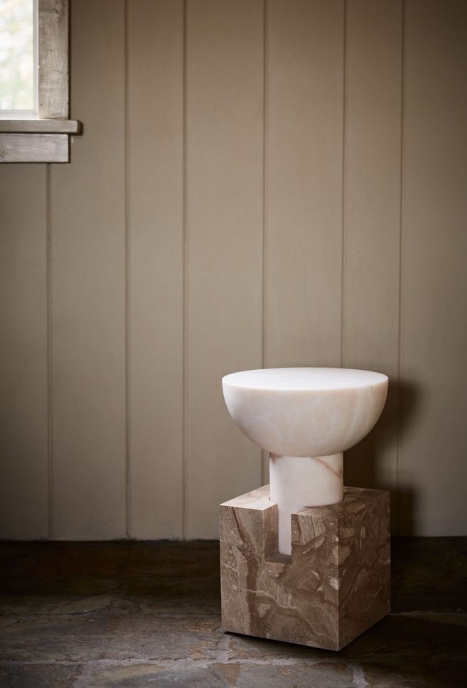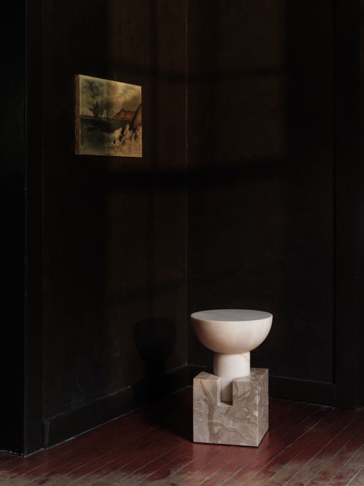 Interlocking shapes in contrasting colors of marble make up this sculptural side table.