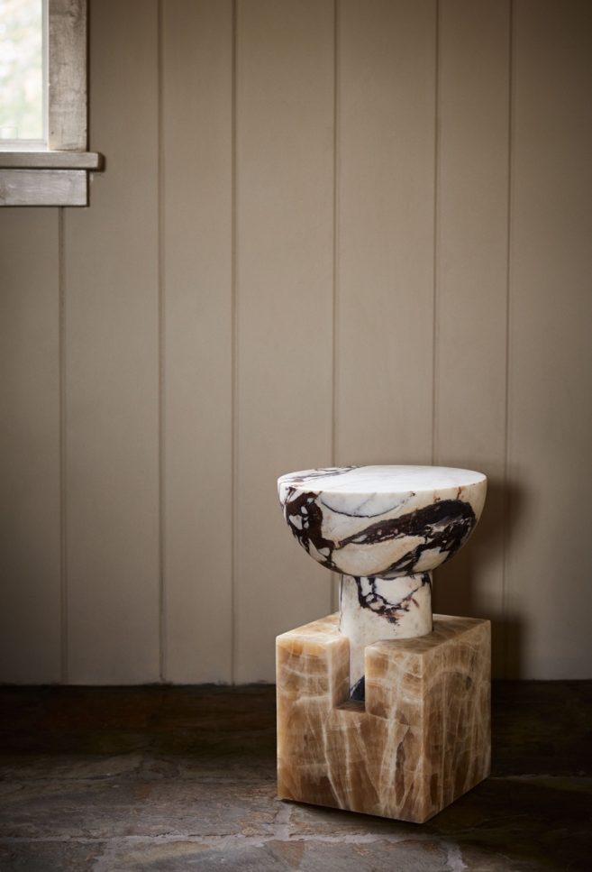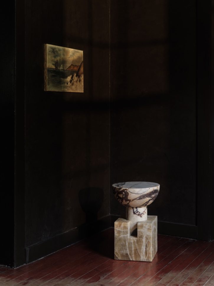 Interlocking shapes in contrasting colors of marble make up this sculptural side table.