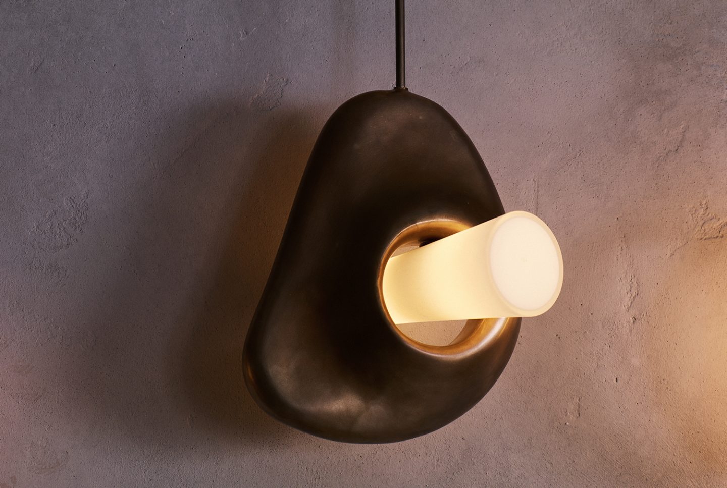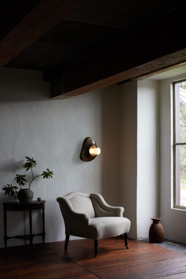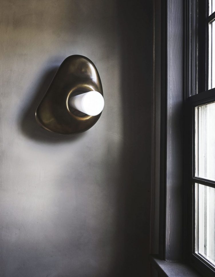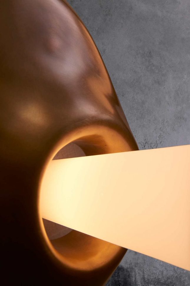 The clay form is cast in bronze, hand blown glass is then added to complete this sculptural light.