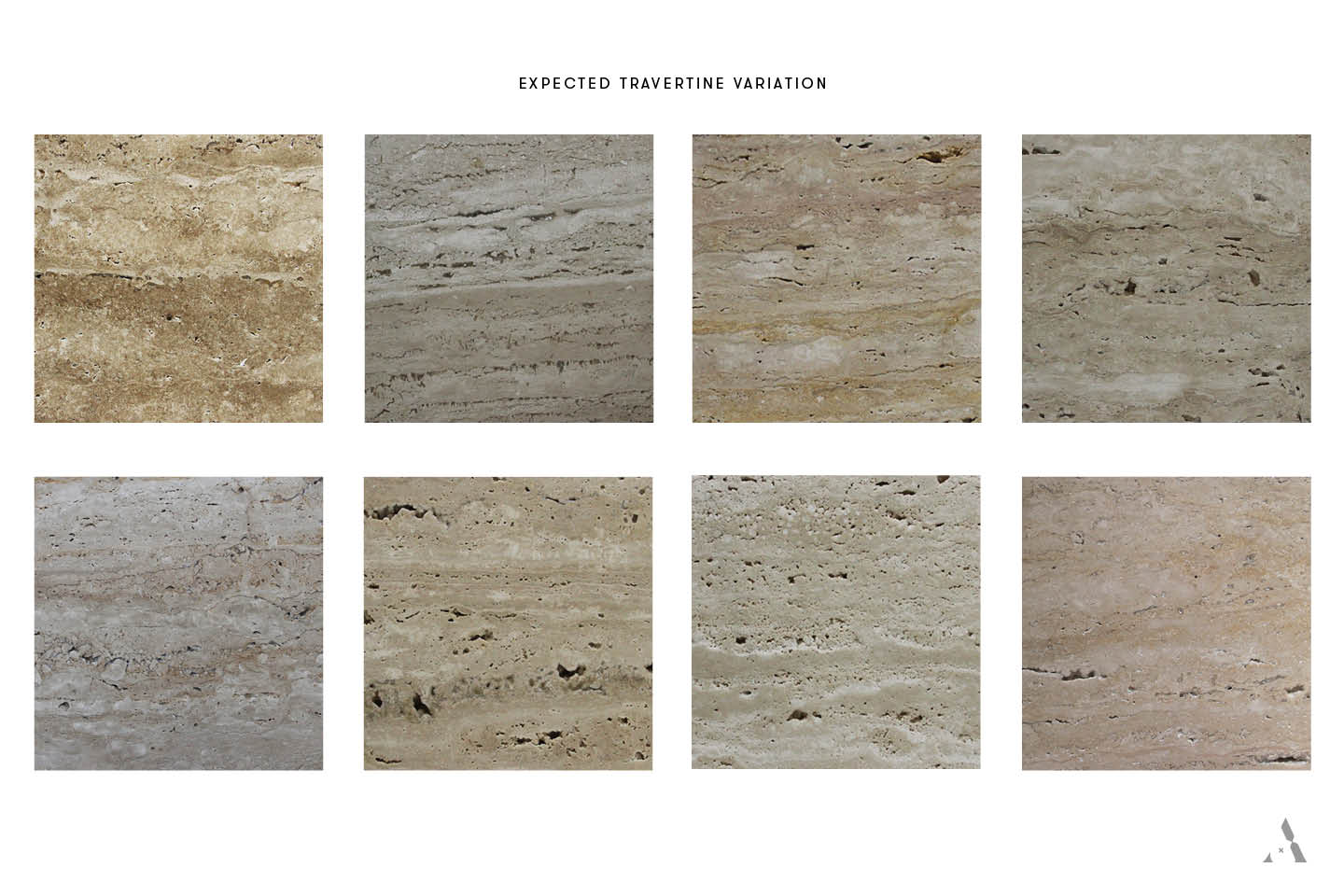 Given the nature of the material, there are various shades and coloring that exist within any given block of travertine. Each set of tables are guaranteed to match, but the exact stone variation will fall within the pictured color options.