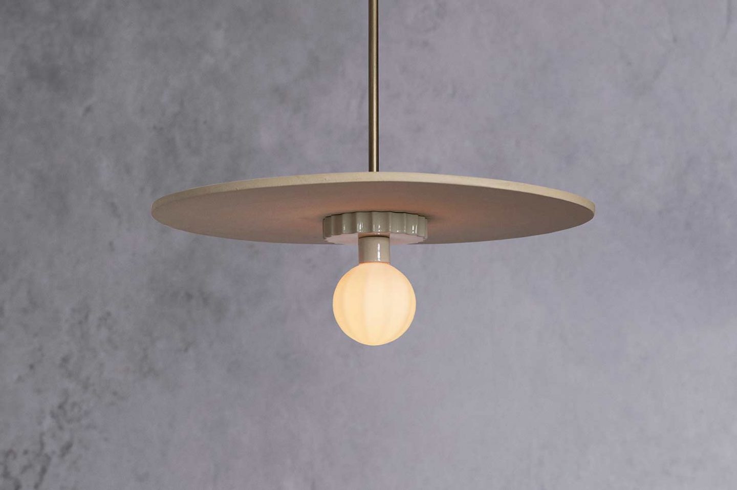 This family of lights are composed of hand-blown ridged glass, a scalloped glaze puck, and topped off with a large unglazed ceramic disc. The difference in texture between the elements are picked up beautifully by the light.