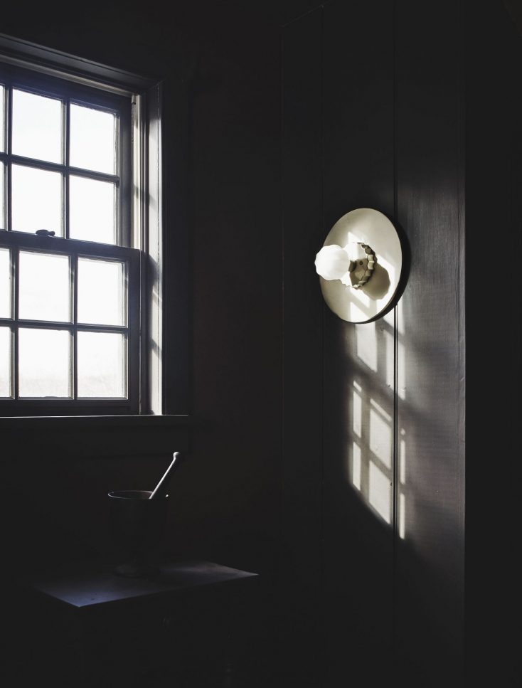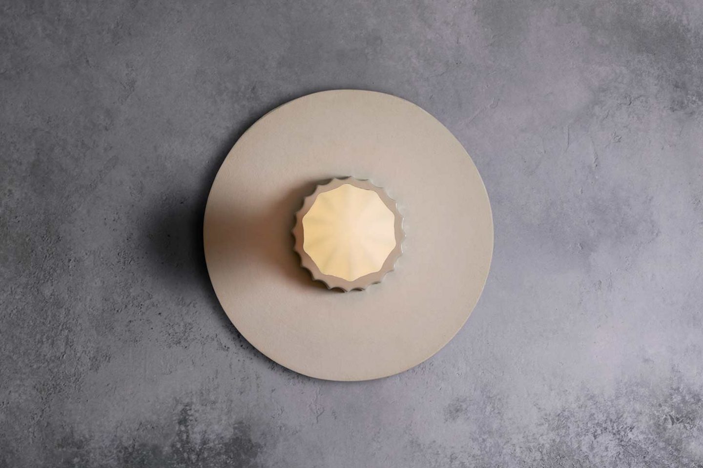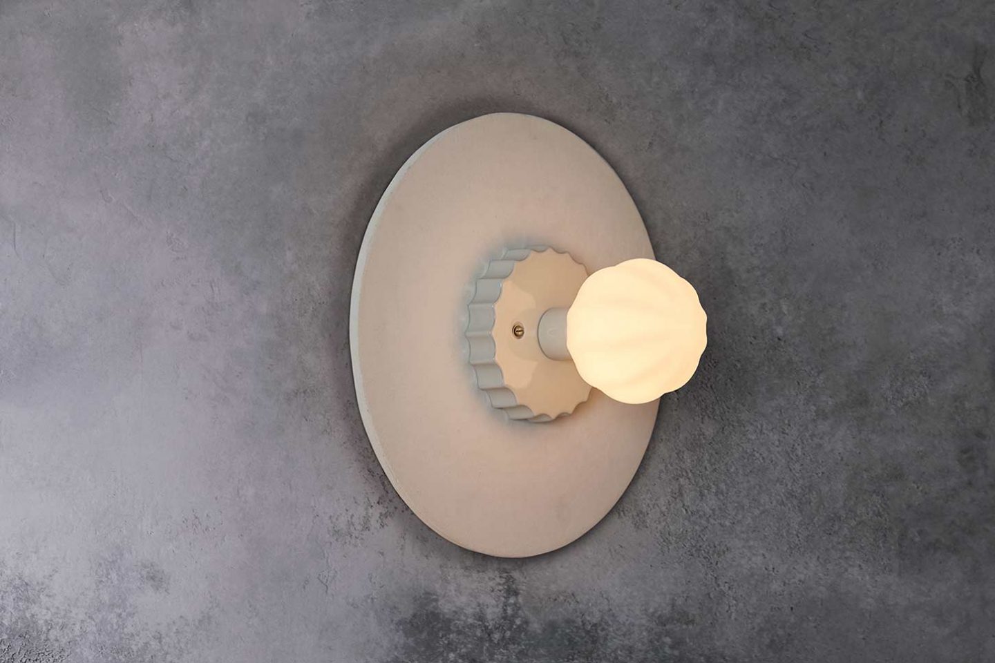 This family of lights are composed of hand-blown ridged glass, a scalloped glaze puck, and topped off with a large unglazed ceramic disc. The difference in texture between the elements are picked up beautifully by the light.