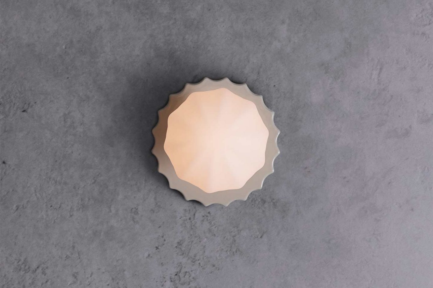 This family of lights are composed of hand-blown ridged glass and a scalloped glaze puck. The difference in texture between the elements are picked up beautifully by the light.