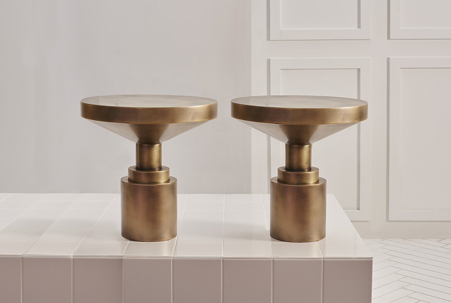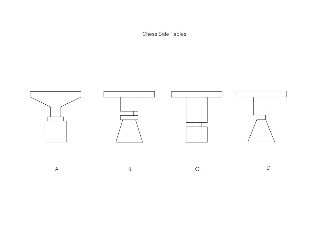 Like chess pieces dotted across board, these sculptures are placed throughout a room. They are made to work in series or alone each of the four shapes is made from cold rolled steel then brass plated and finished with a hand rubbed patina. Handmade in New York.