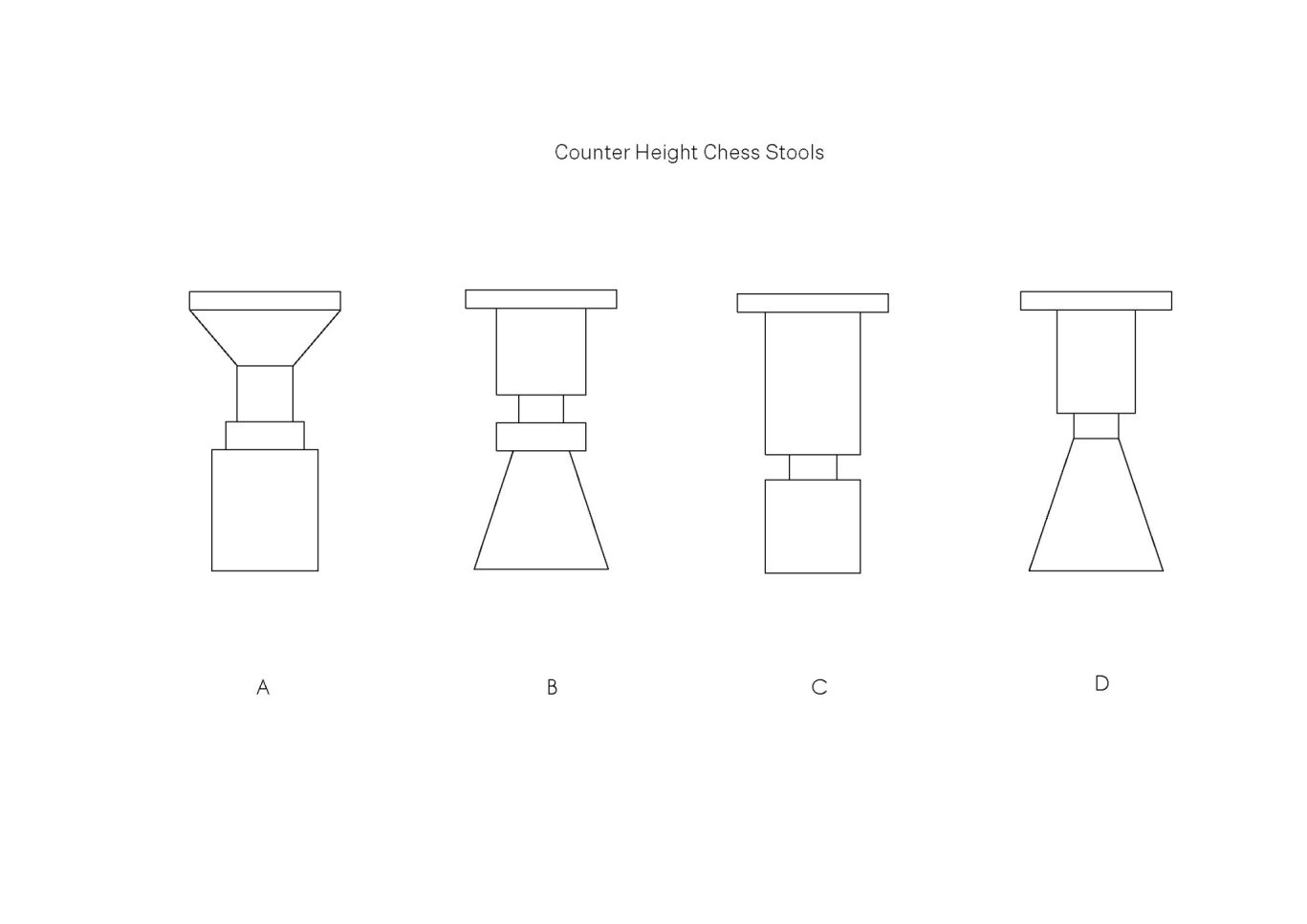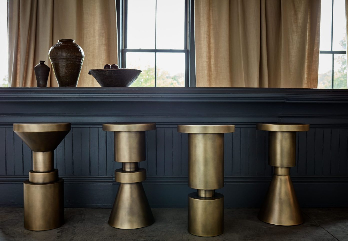 Taking their cue from the Original Chess Stool series, the forms have been elongated — perfect for counter height use. Made to work in series or alone, each of the four shapes is made from cold-rolled steel, then brass-plated and finished with a hand-rubbed patina.