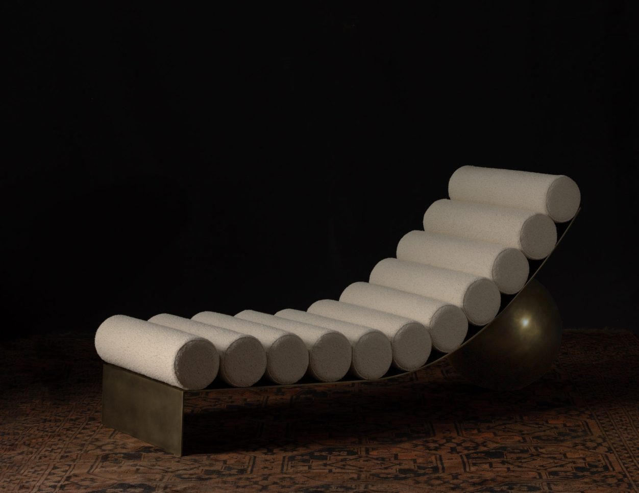 Solid steel is carefully bent into a perfect reclining angle. The curve rests on a single sphere with bolsters for cushioning, both hand finished with a light antique brass patina.