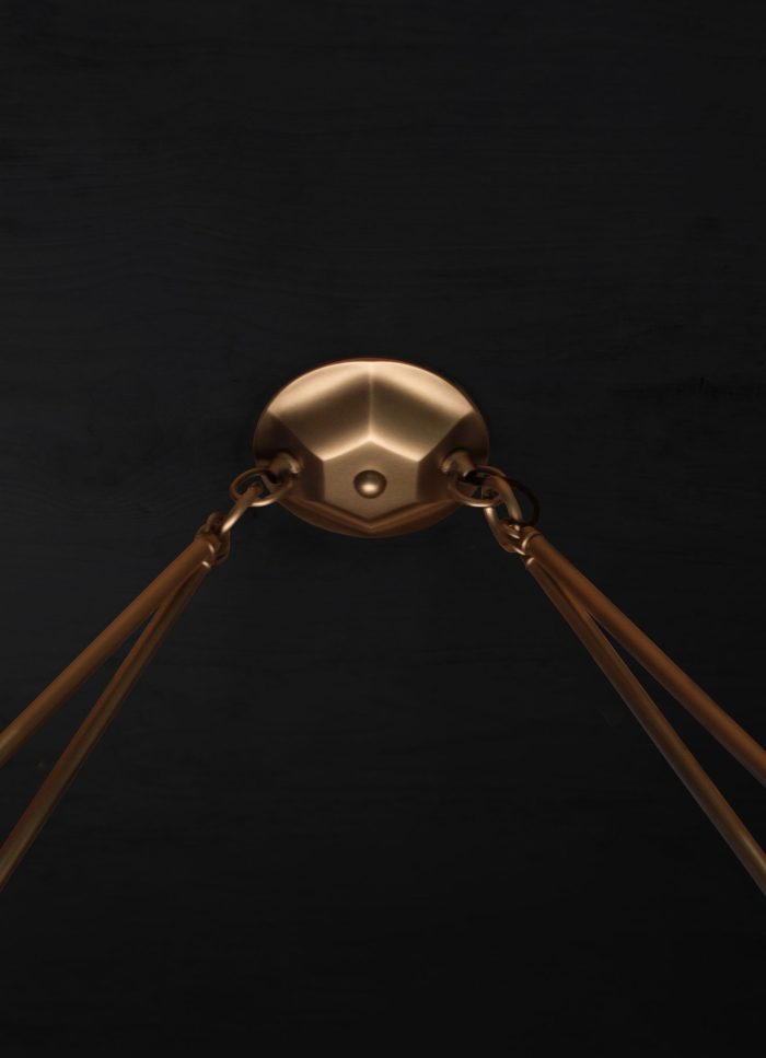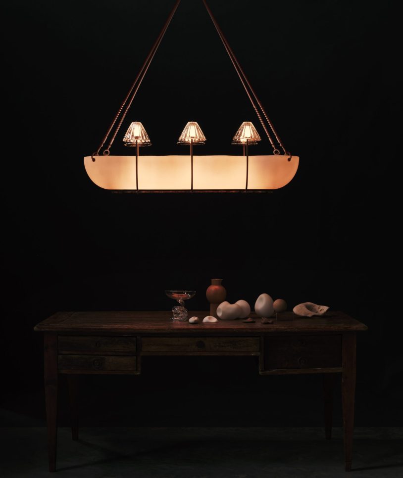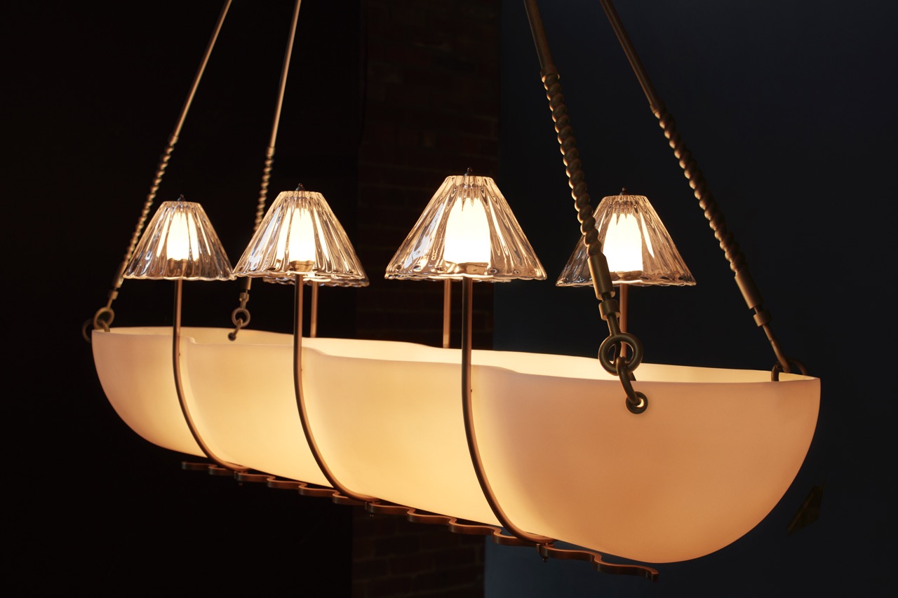 A monumental basin of tinted cast acrylic topped with hand-made scalloped glass cones is hung from and encased within an armature of nickel plated and patinated steel, replete with small details of decoration and joinery.