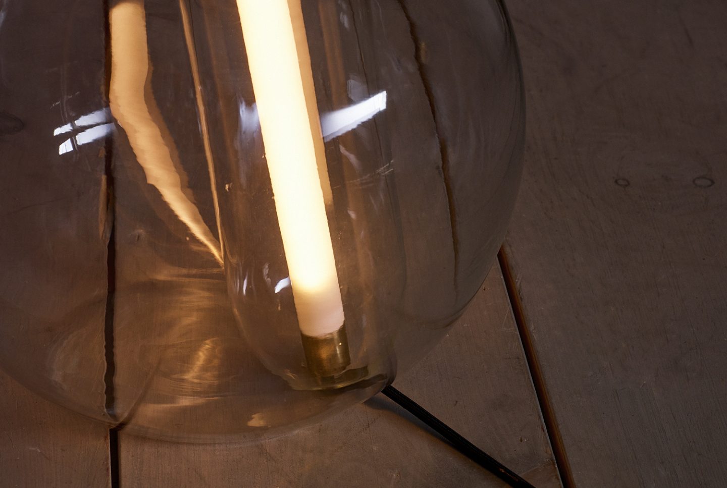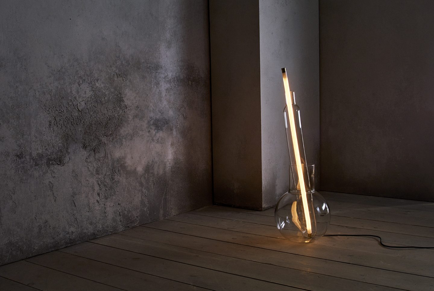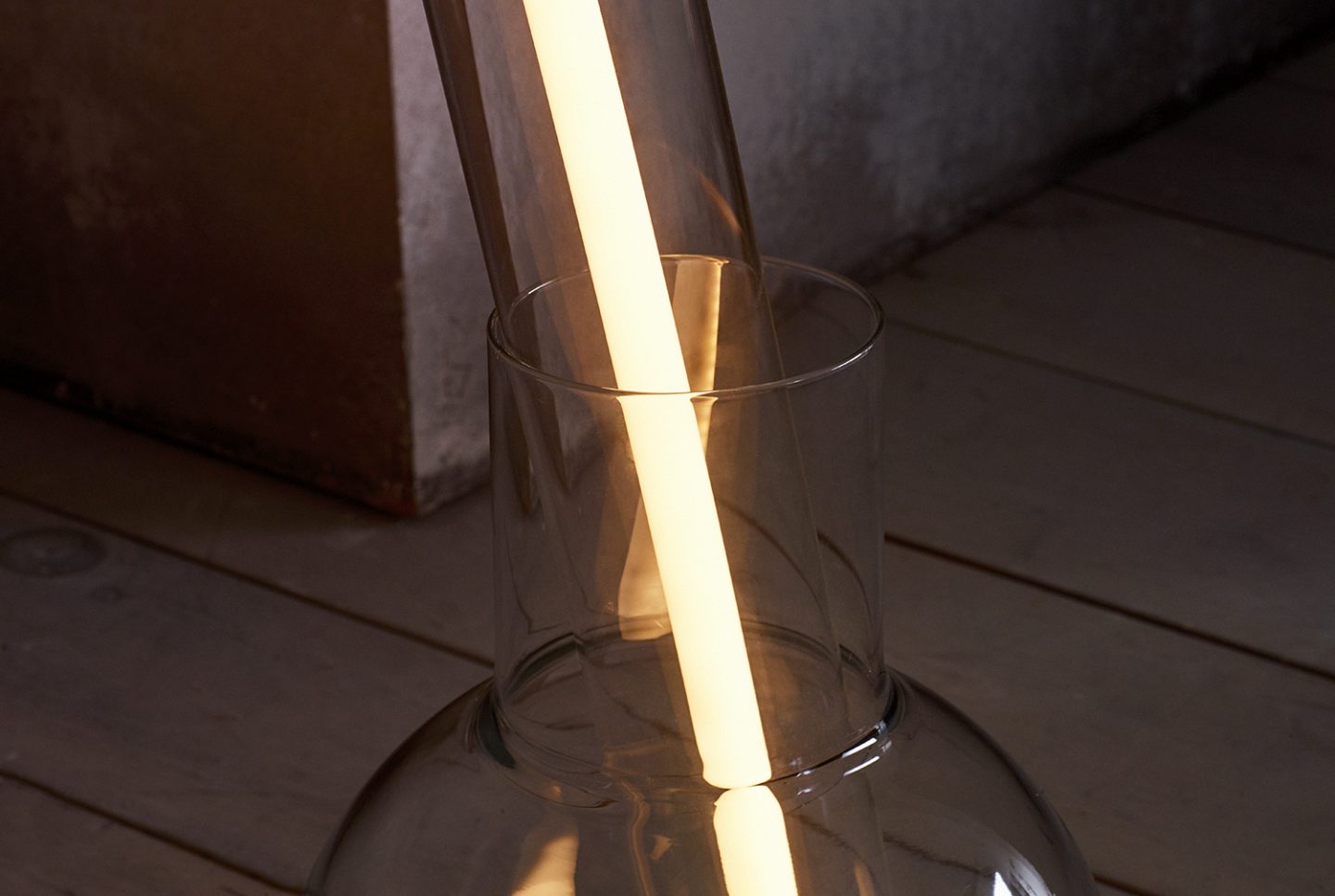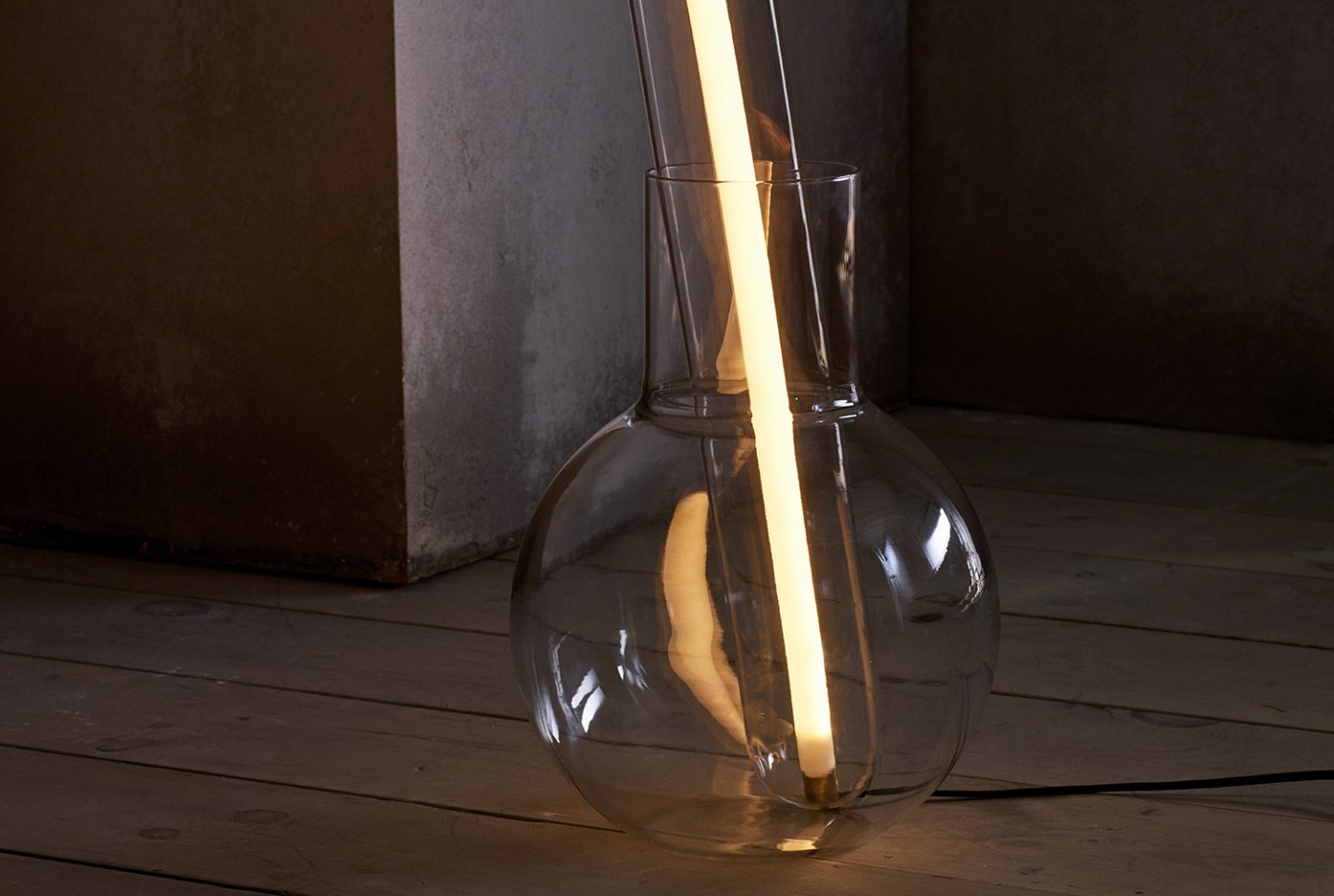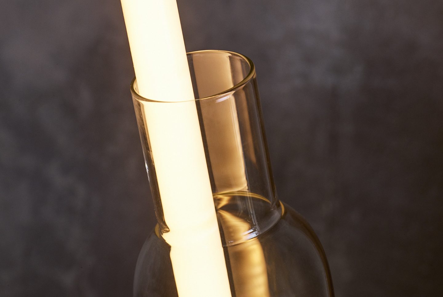 This lamp explores the relationship between glass and light, subverting its normal interaction. Here, glass becomes the softer of the two in the partnership, and the light becomes a graphic line in the transparent form.