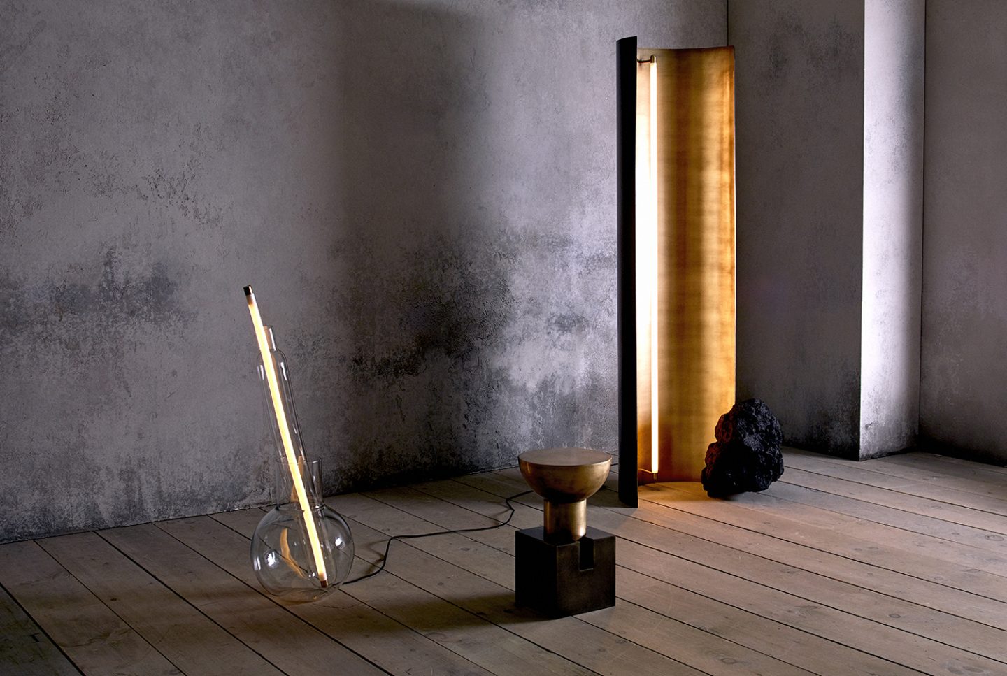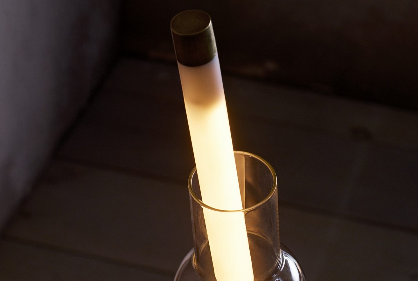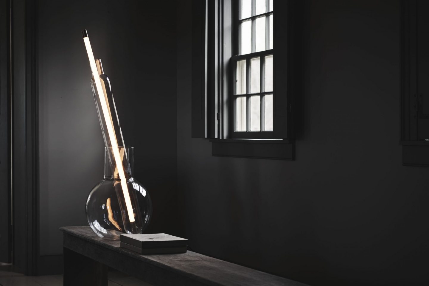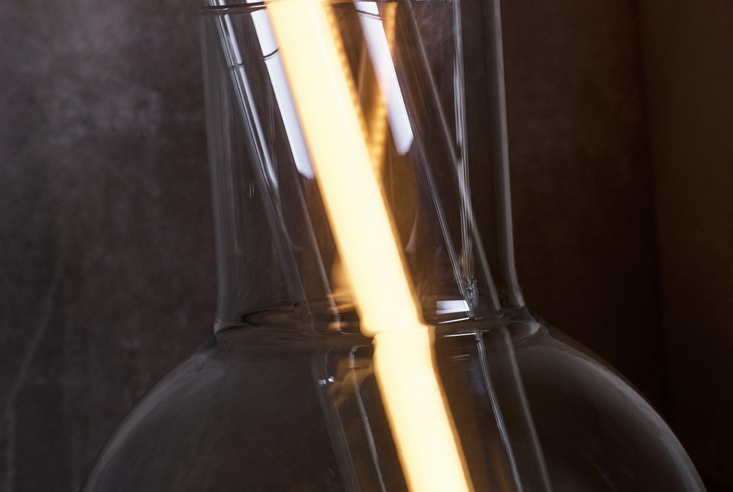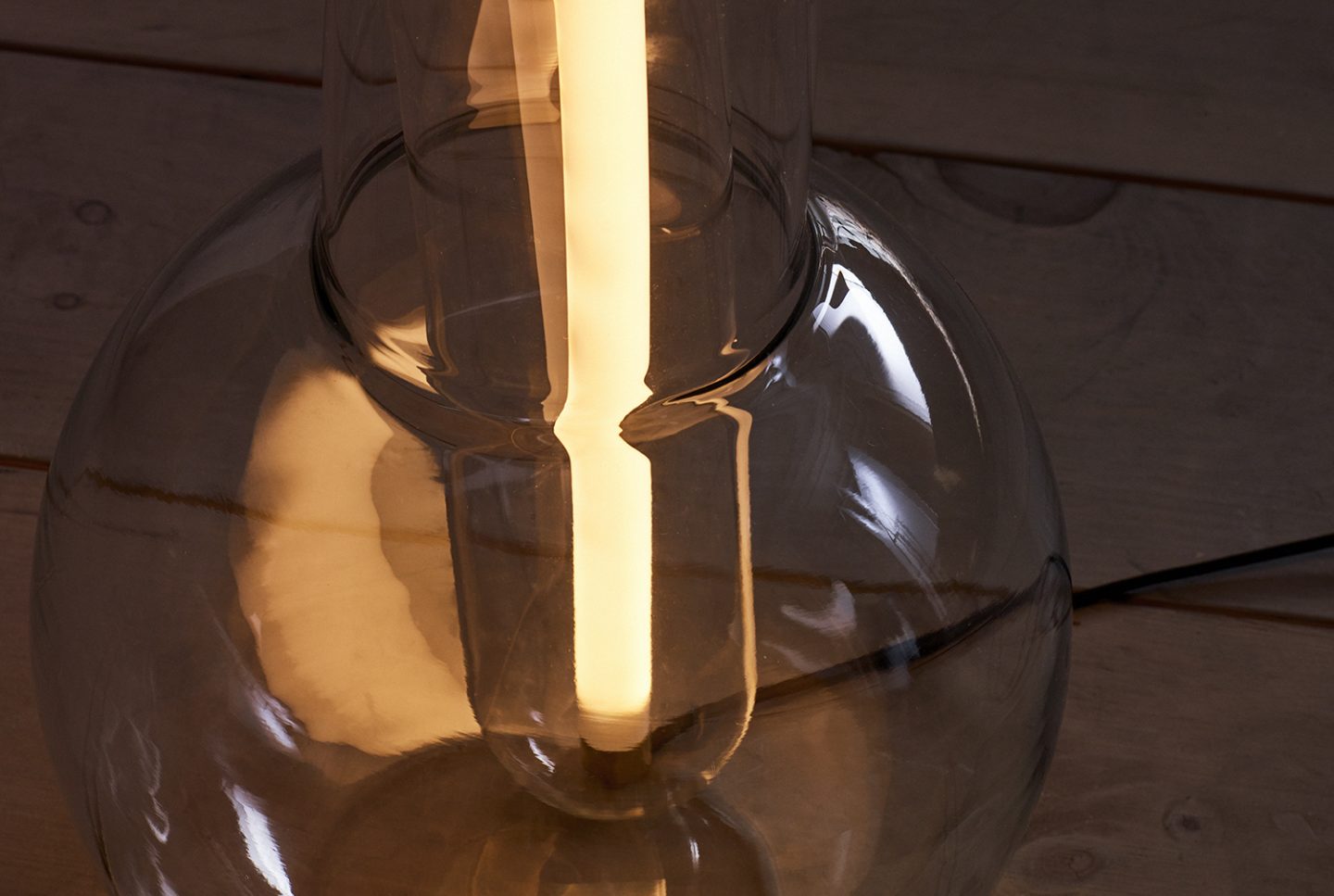 This lamp explores the relationship between glass and light, subverting its normal interaction. Here, glass becomes the softer of the two in the partnership, and the light becomes a graphic line in the transparent form.