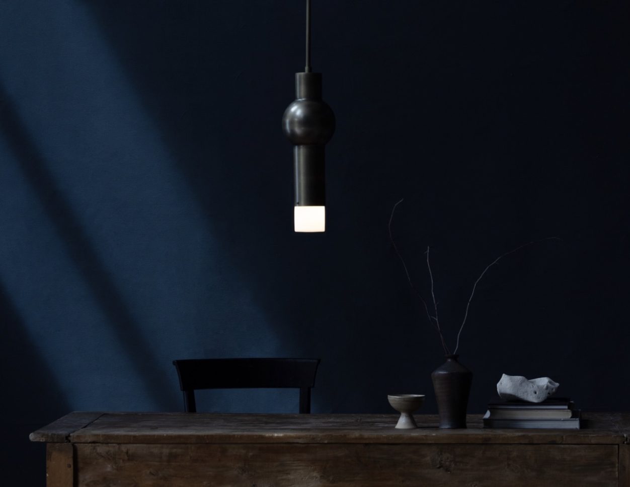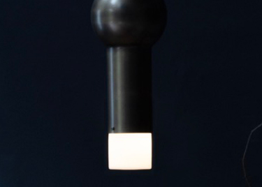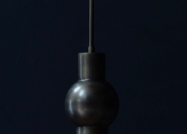 A finely balanced form of hand-finished brass-plated steel with a frosted glass diffuser.
