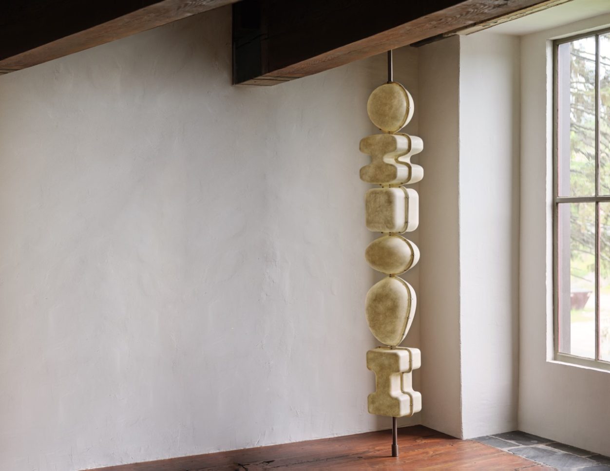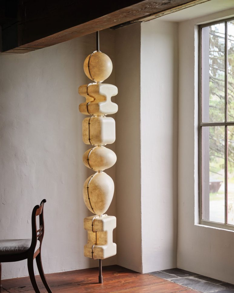 Sculptural forms are stacked along a hand-finished tube running from floor to ceiling, with a central light source providing a soft, organic glow which accentuates the inherent texture of the fiberglass material. The outlines of the forms are punctuated by an aestheticized interpretation of rivets.