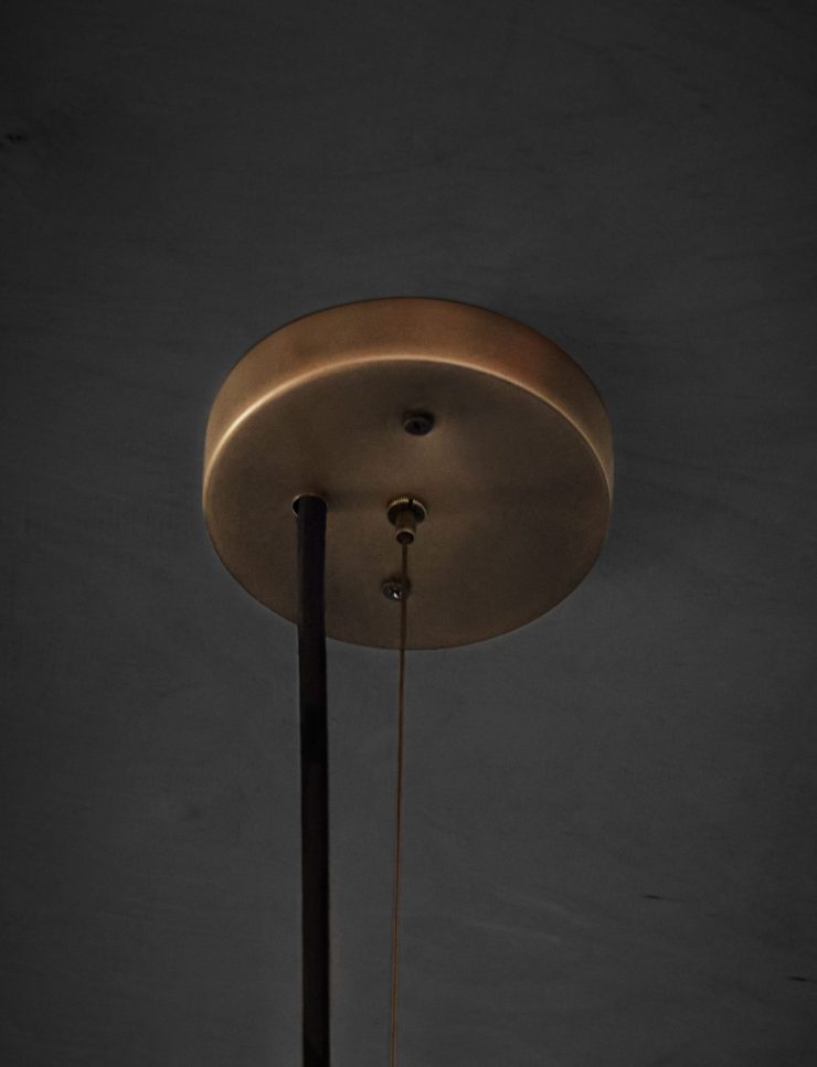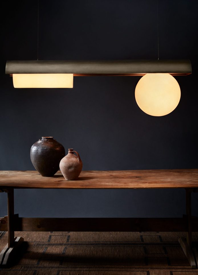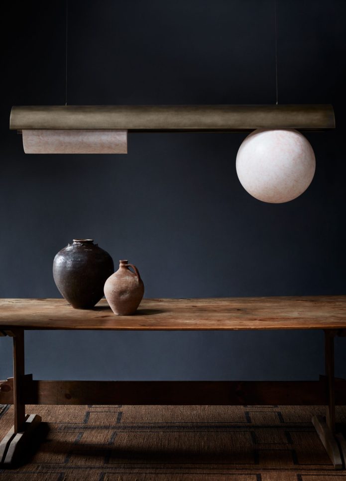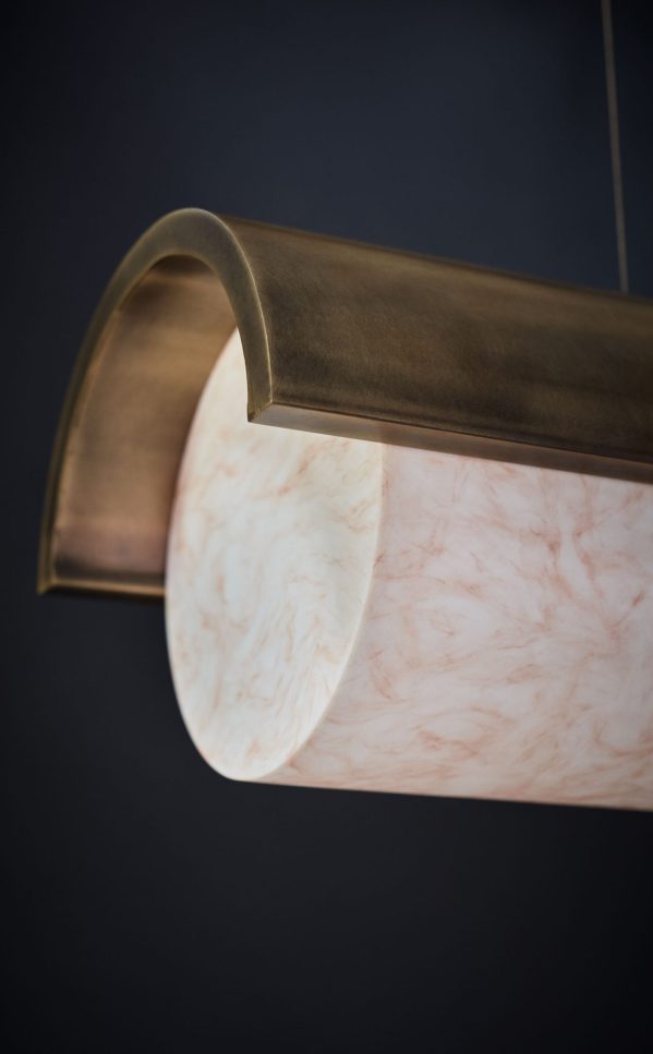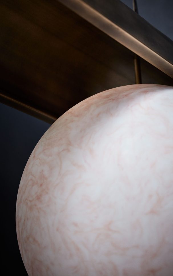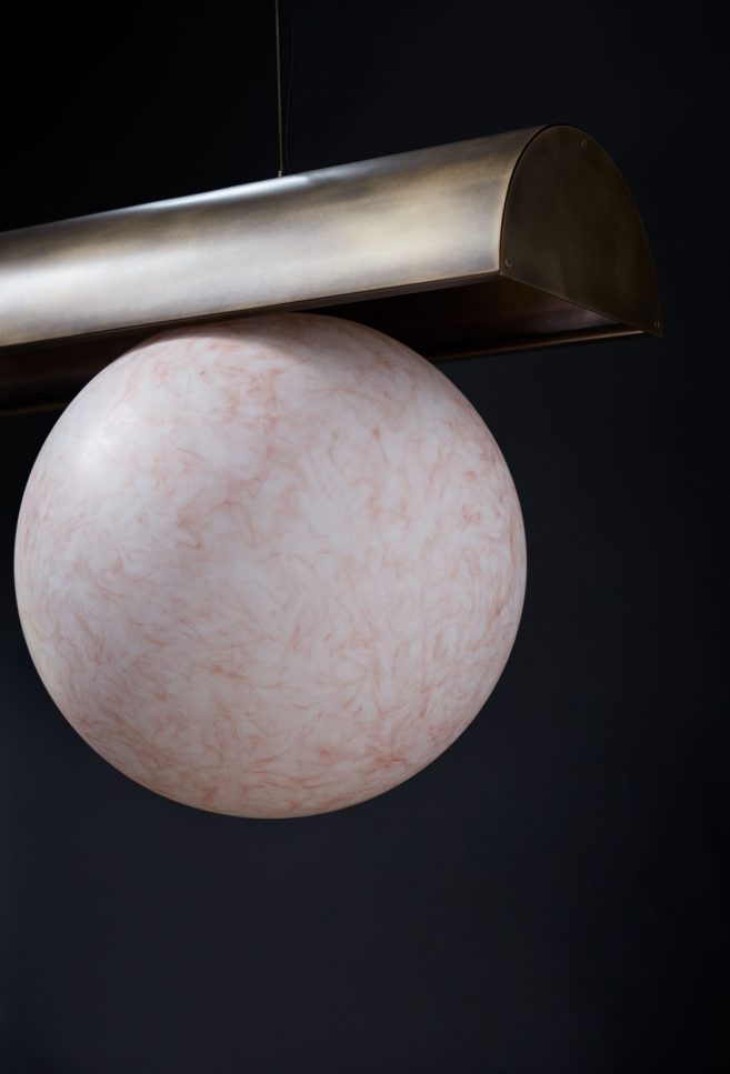 Inspired by the rare moments when a process called Rayleigh scattering gives the moon a magical rose glow. A curved antique brass shell holds an acrylic sphere and cylinder, which are carefully hand-painted to achieve a rose alabaster glow.