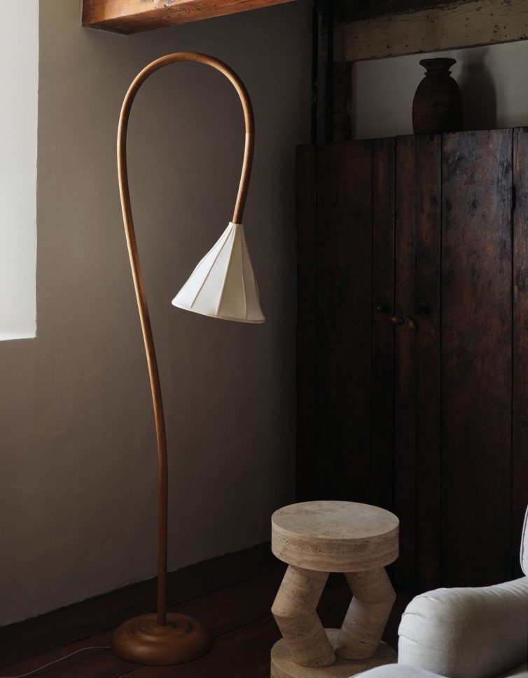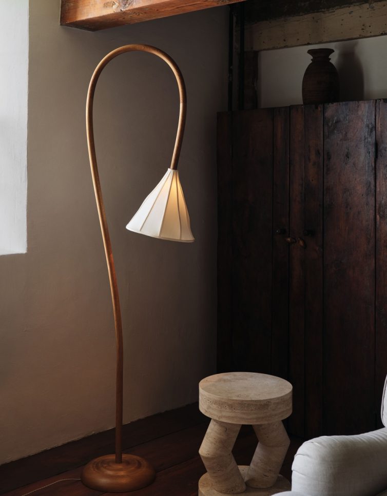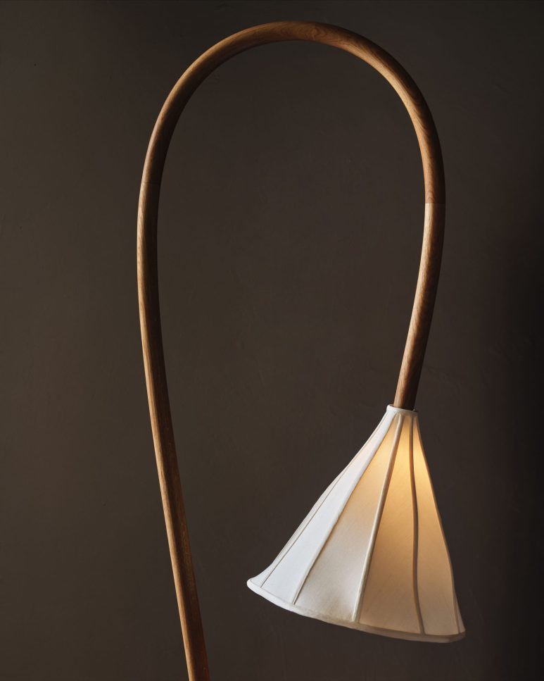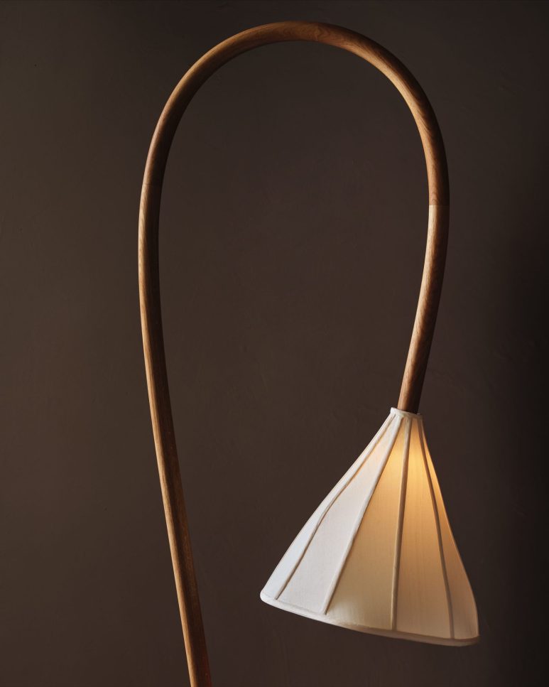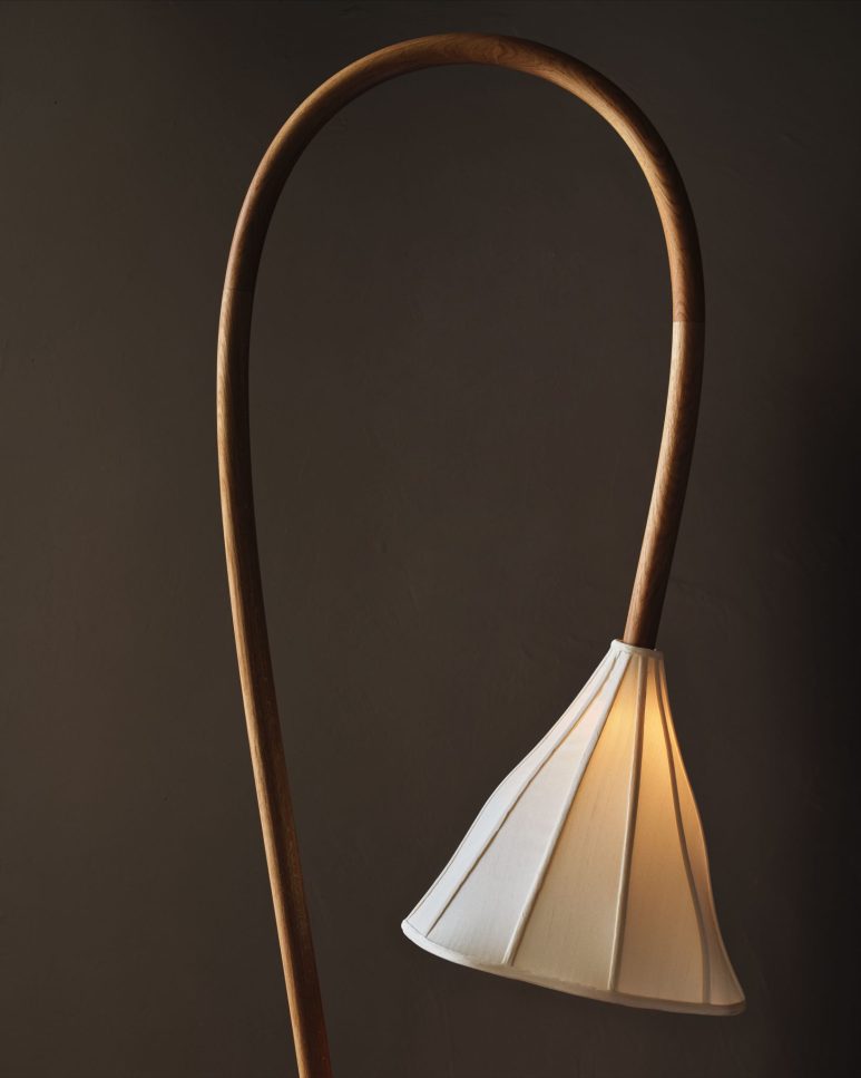 A sinuous curve of carved hardwood terminates in a hand-upholstered conical silk shade. Inside the shade, a hand blown white glass teardrop houses the light source.