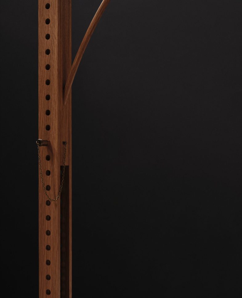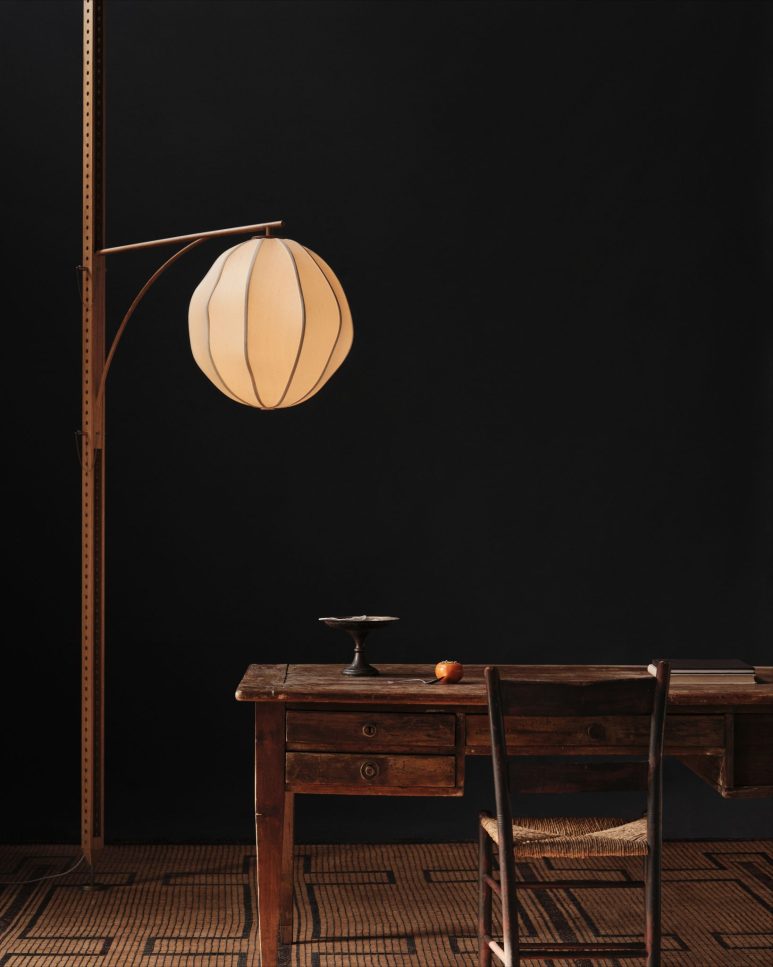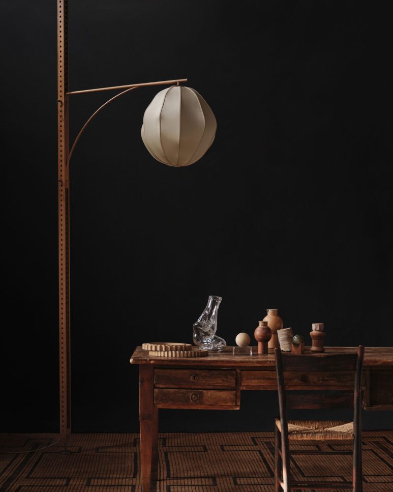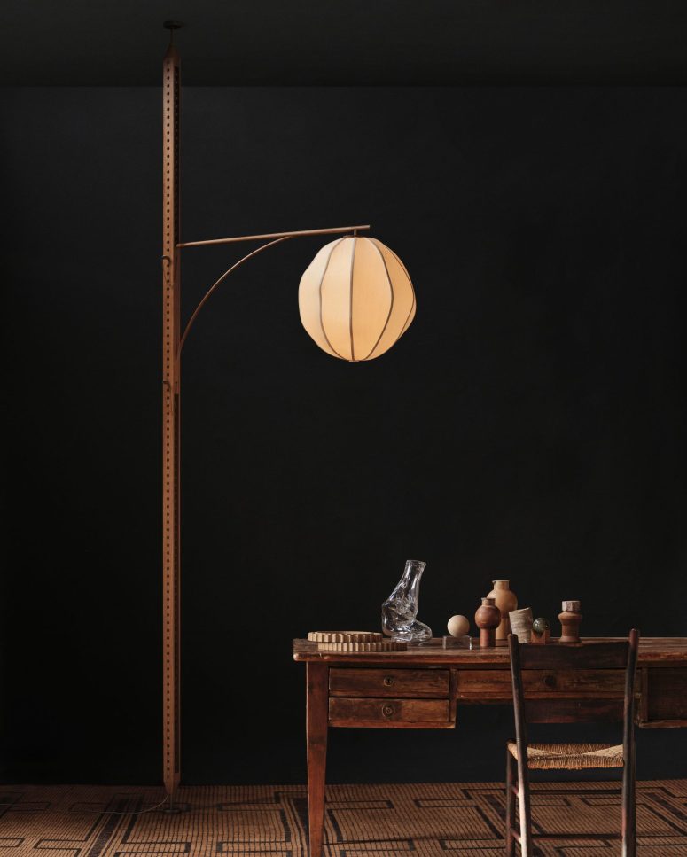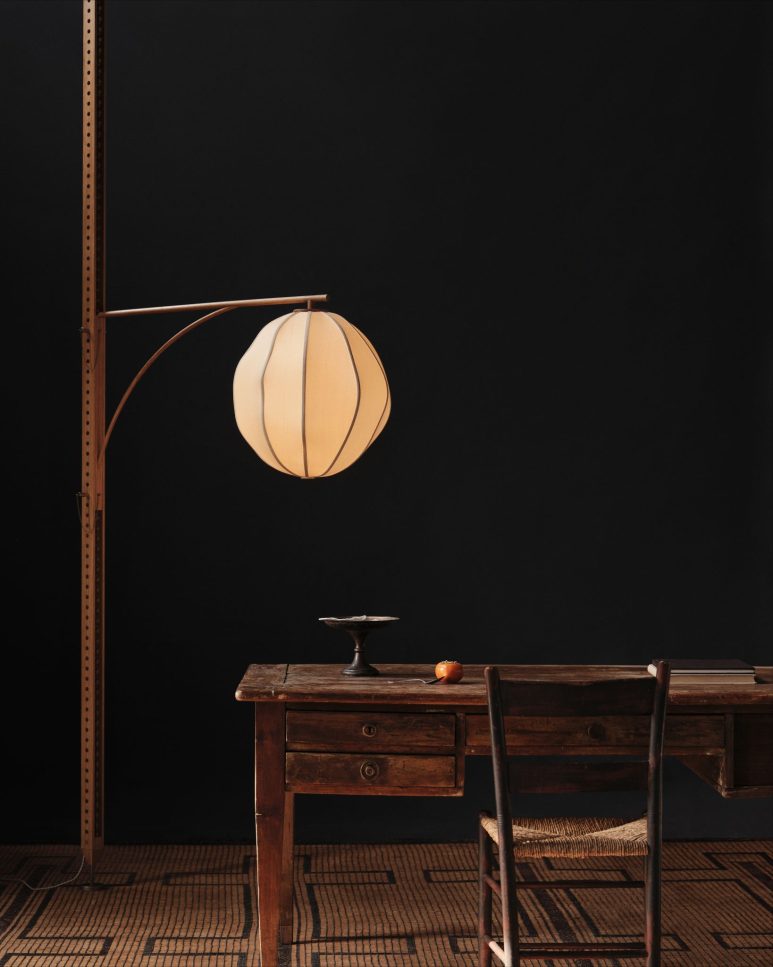 A perforated hardwood post stretches from floor to ceiling, allowing the lamp armature to be moved up or down to the desired height. A hand-upholstered silk globe is suspended from the end of the armature, providing a warm glow.