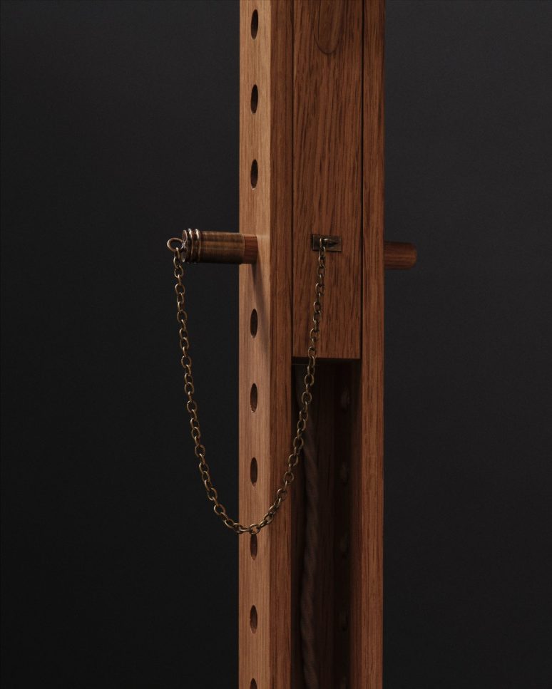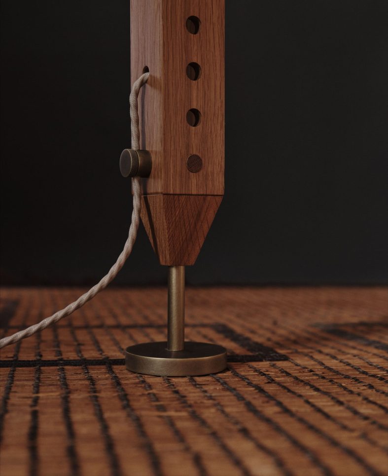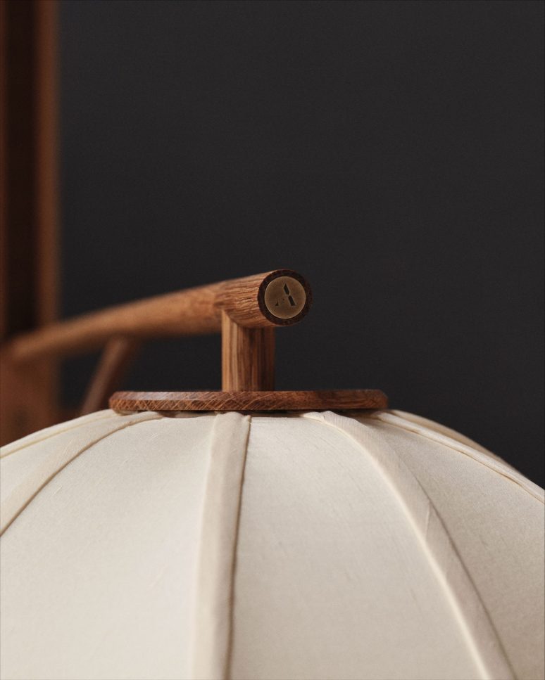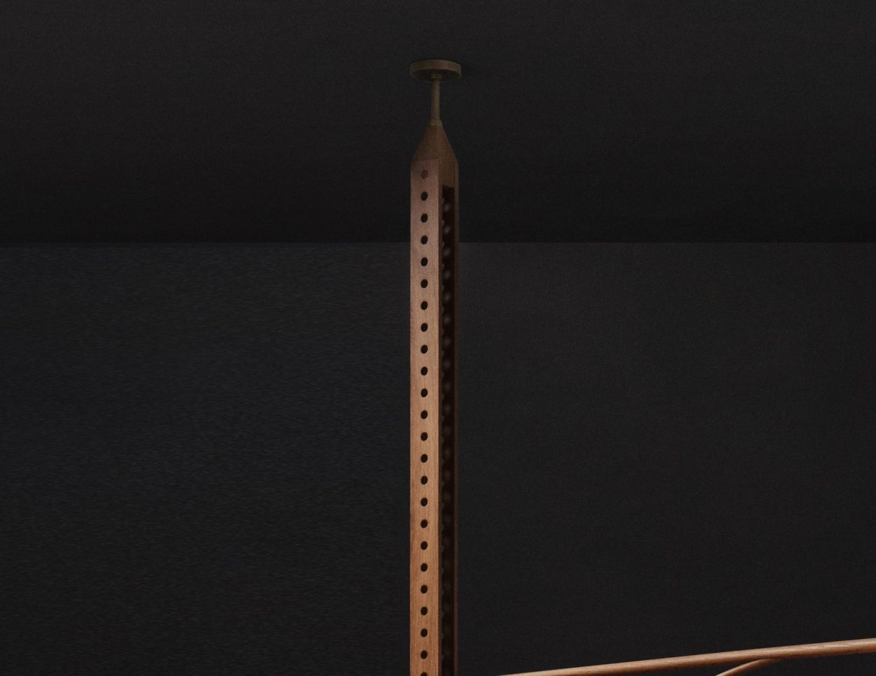 A perforated hardwood post stretches from floor to ceiling, allowing the lamp armature to be moved up or down to the desired height. A hand-upholstered silk globe is suspended from the end of the armature, providing a warm glow.