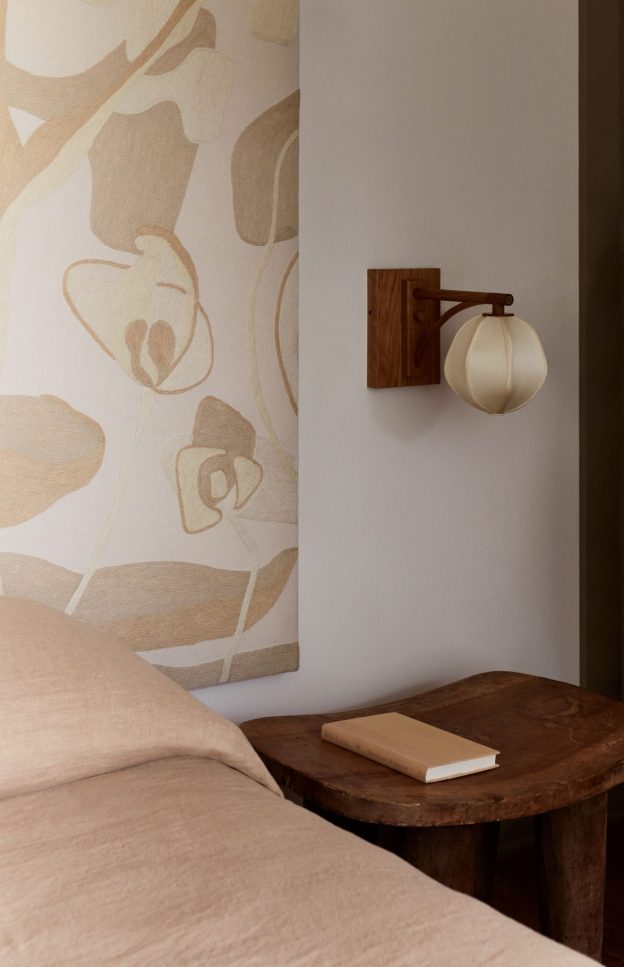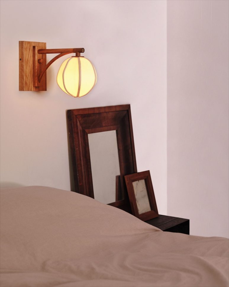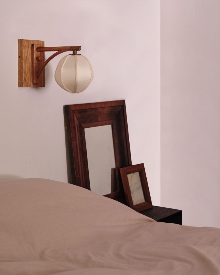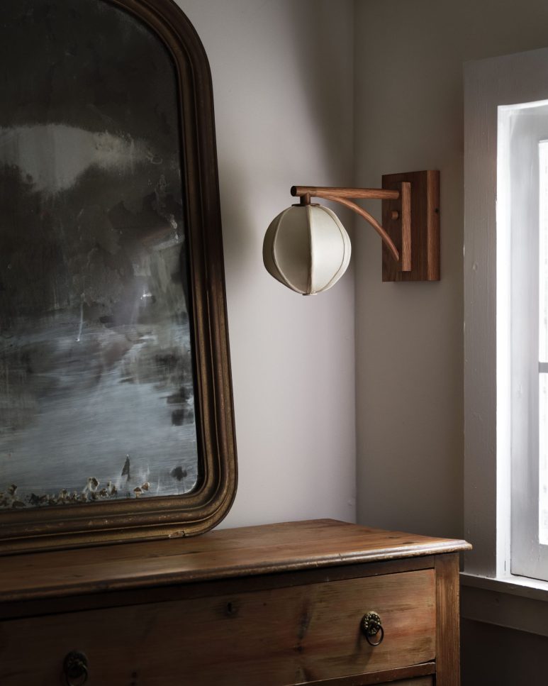 This small sconce is made entirely from hardwood, with a hand-upholstered silk globe suspended from the end of the armature providing a warm glow.