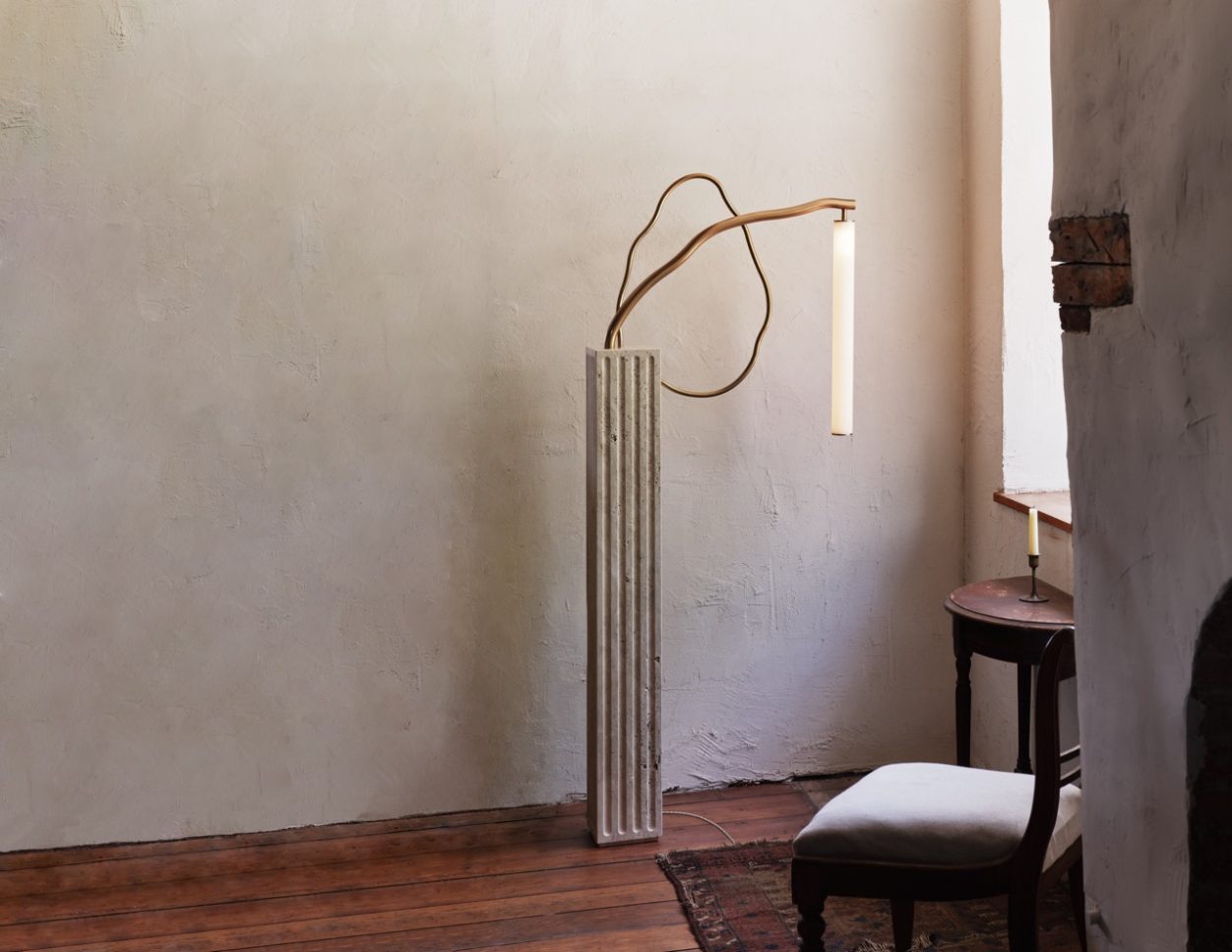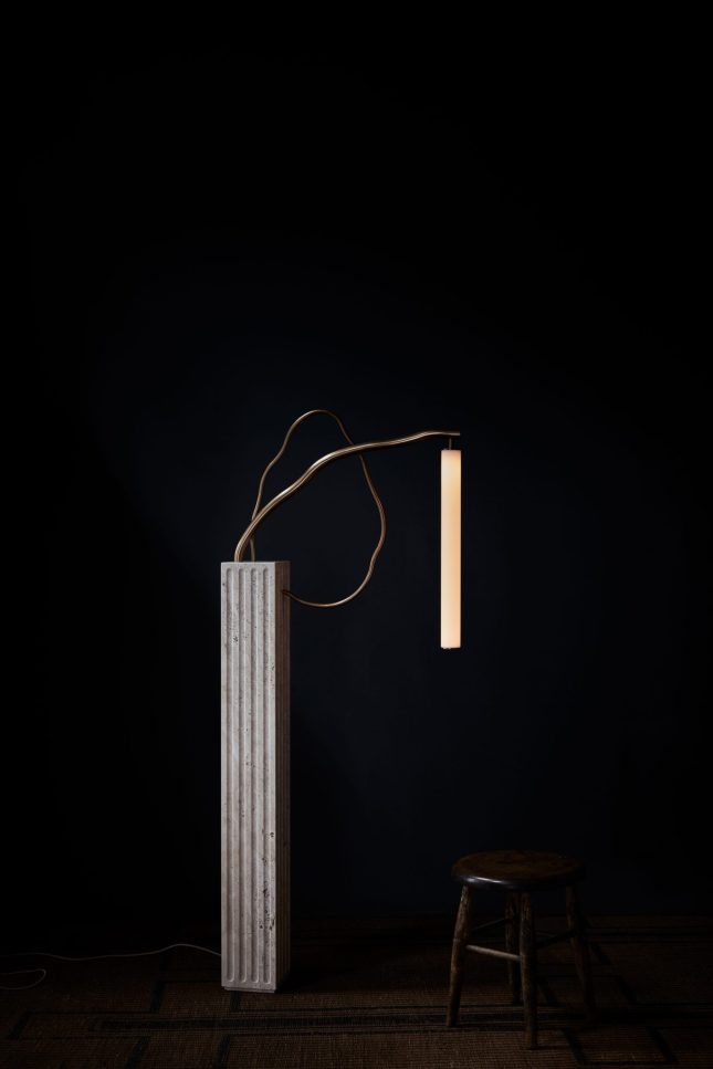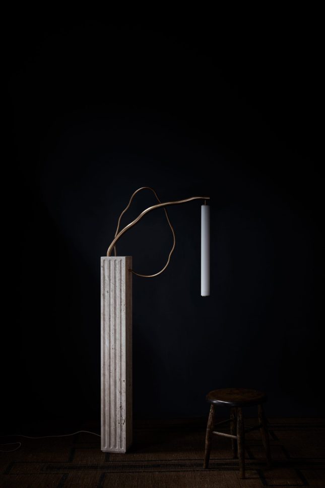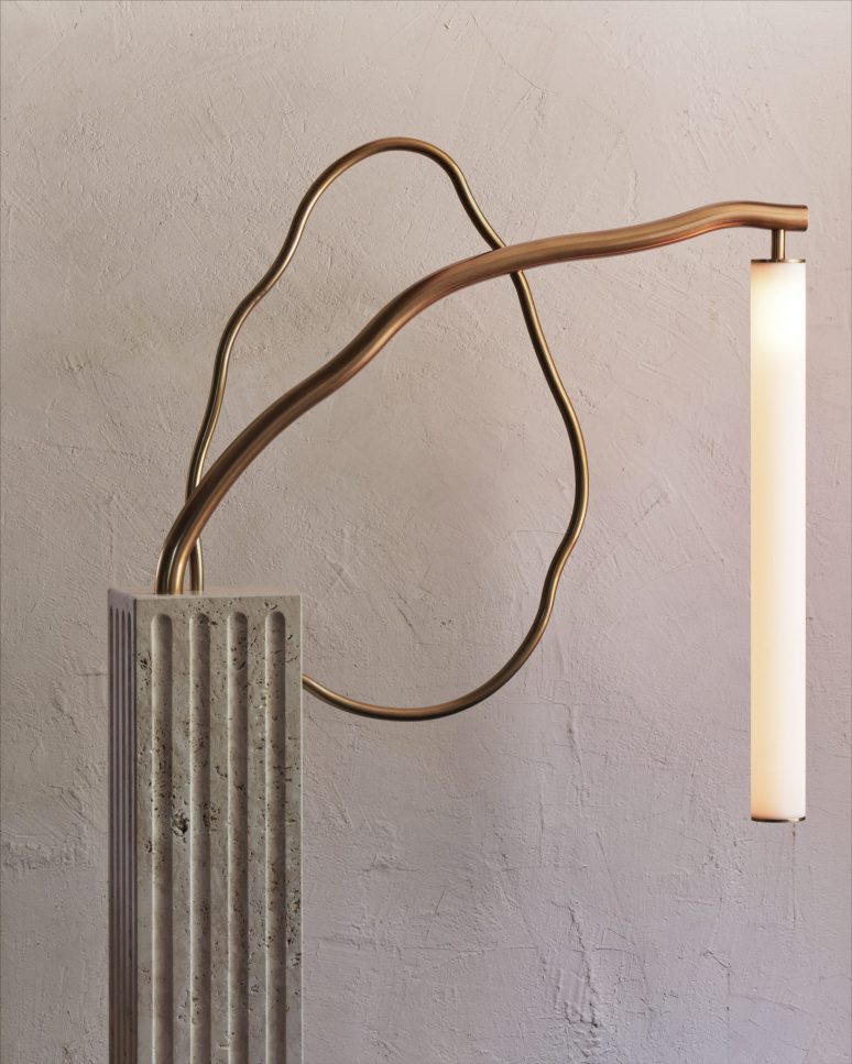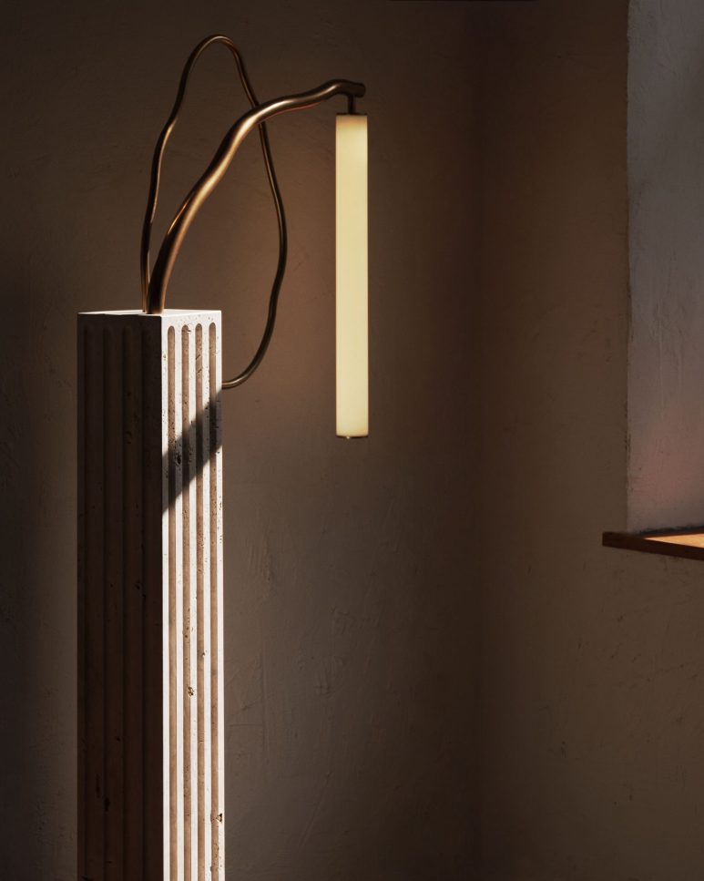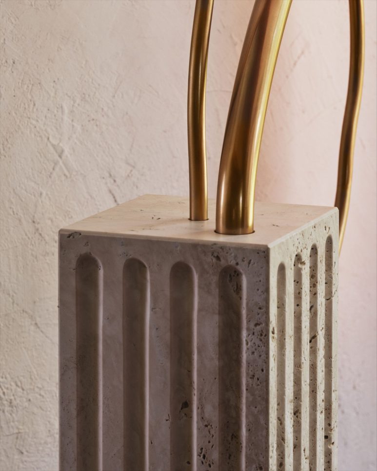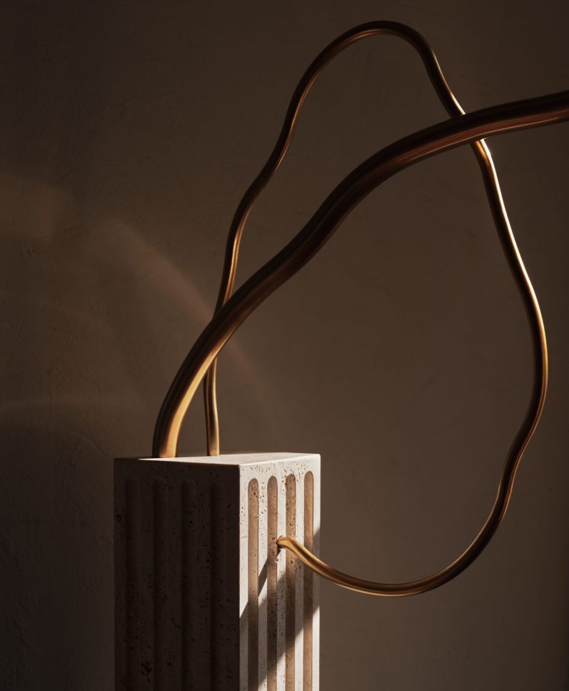 Organic tubes of bronze emerge from a rectangular fluted travertine plinth. An acrylic tube suspended in space provides a soft glow.