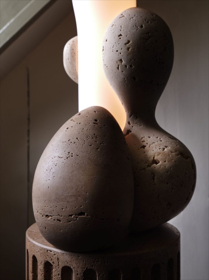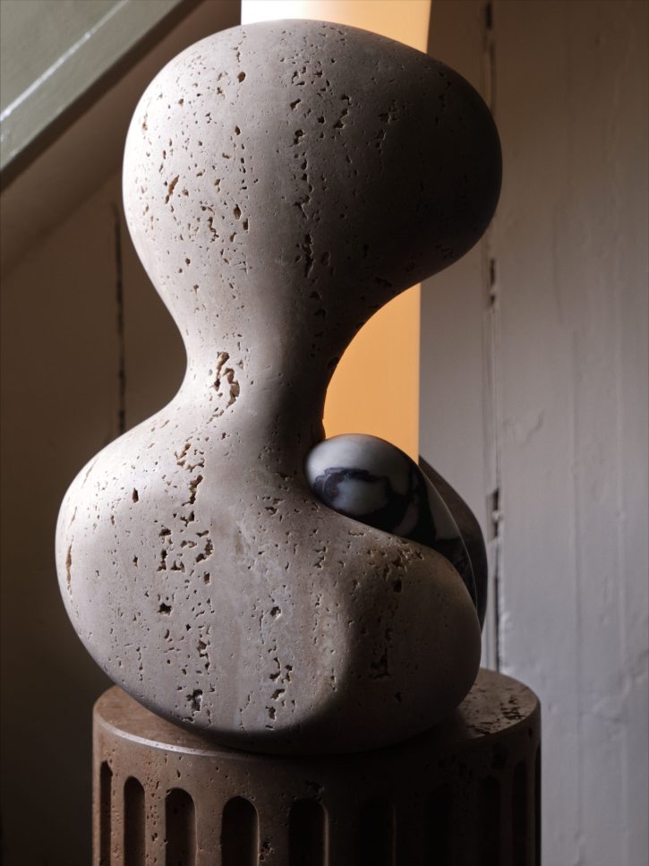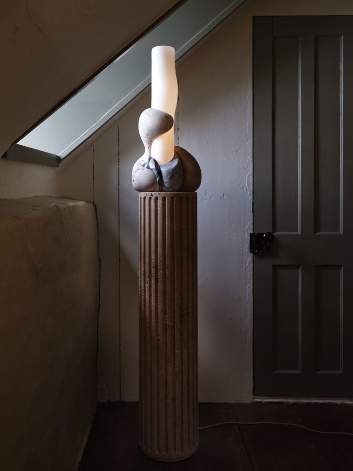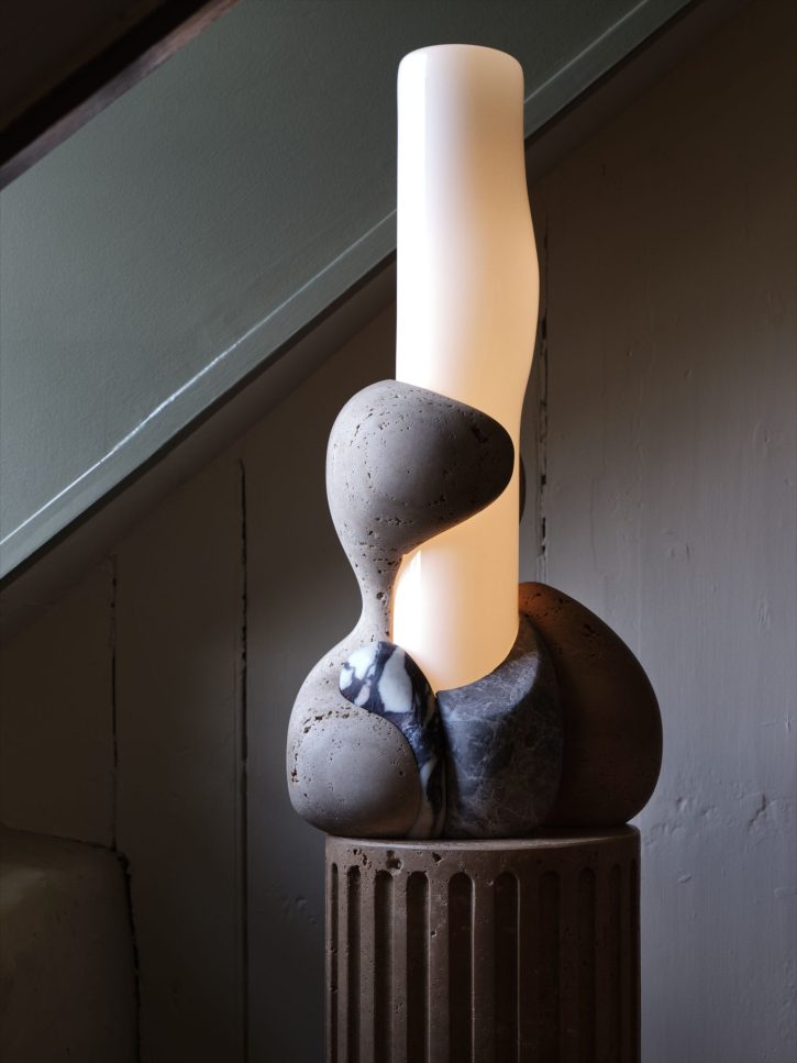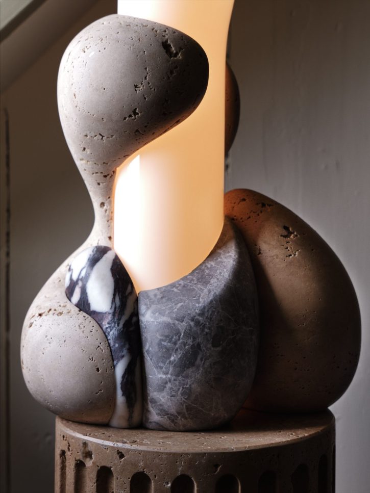 Perched atop of a round fluted travertine plinth, organic forms carved from various types of stone embrace a hand-blown glass cylinder which glows from within.
