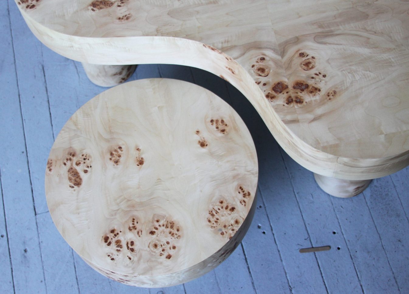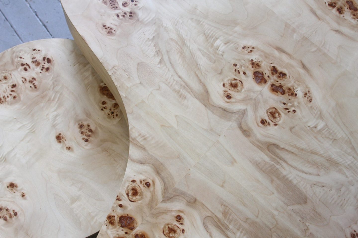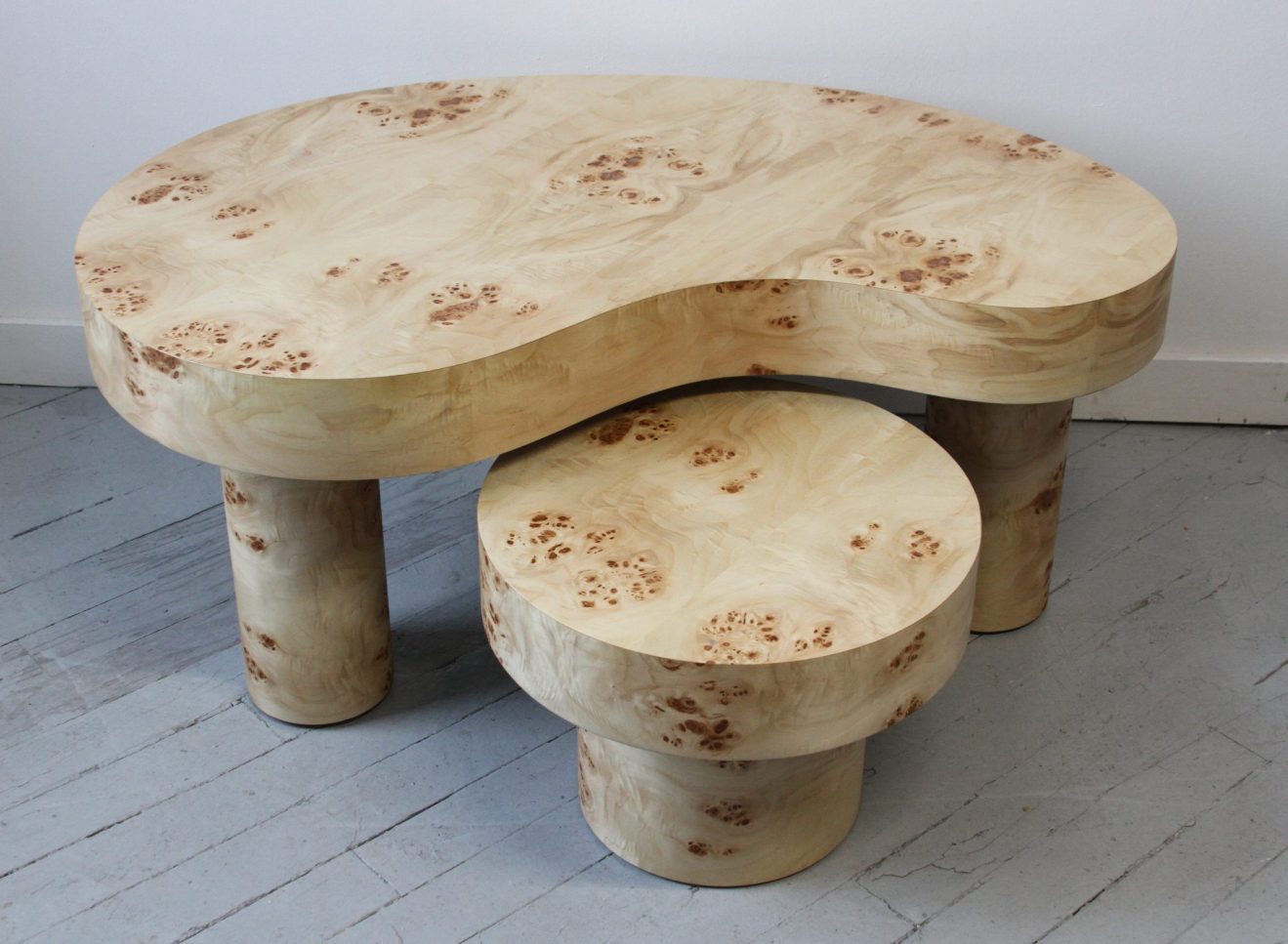 Made from beautiful golden burl, the two tables nest perfectly and can be moved individually to suit any space.