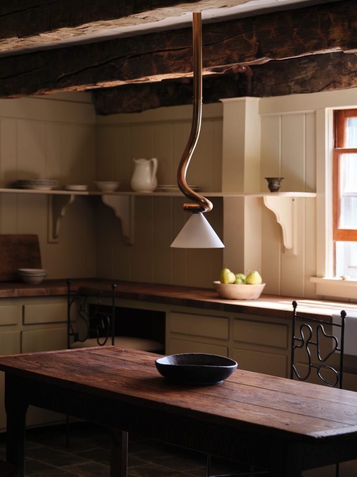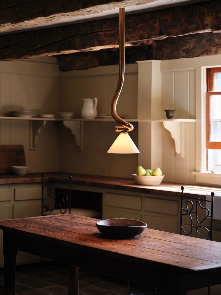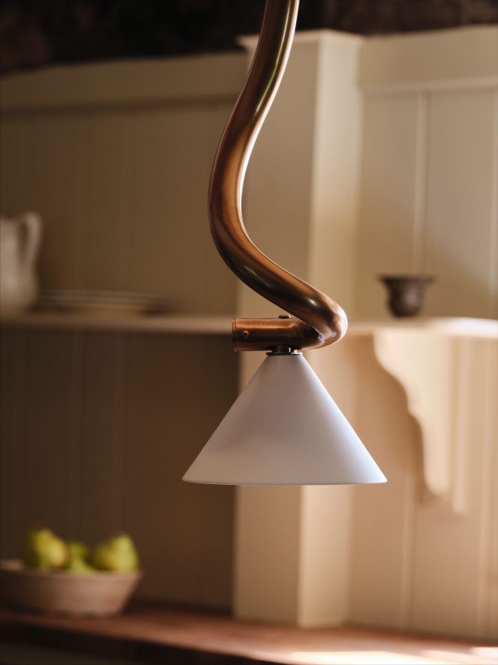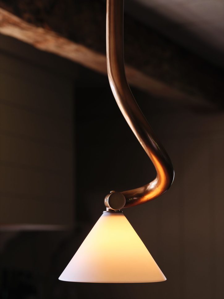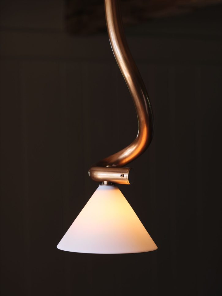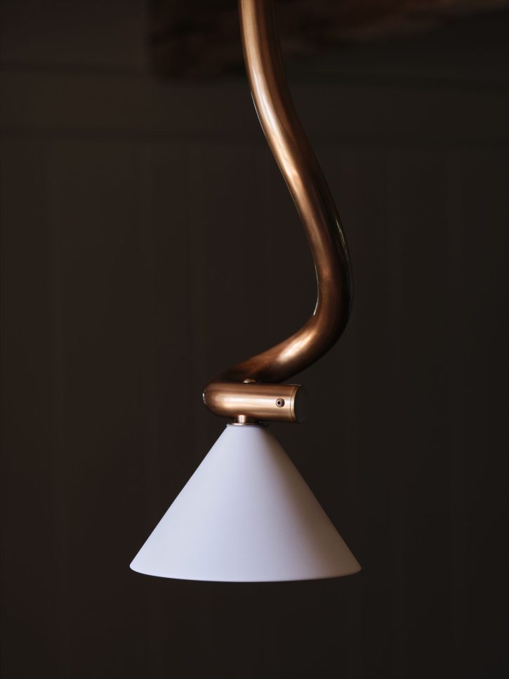 A single porcelain shade is suspended from a curved metal tube. Inside the shade, a hand blown white glass teardrop houses the light source.