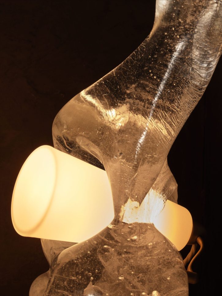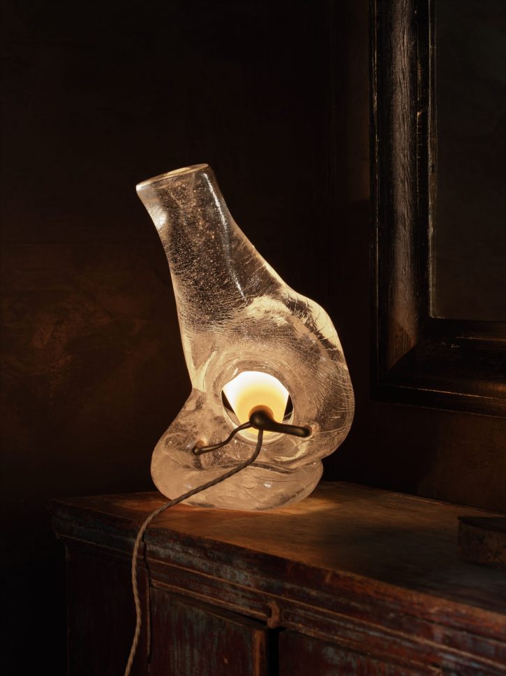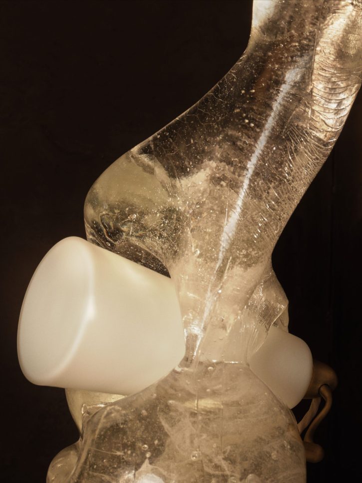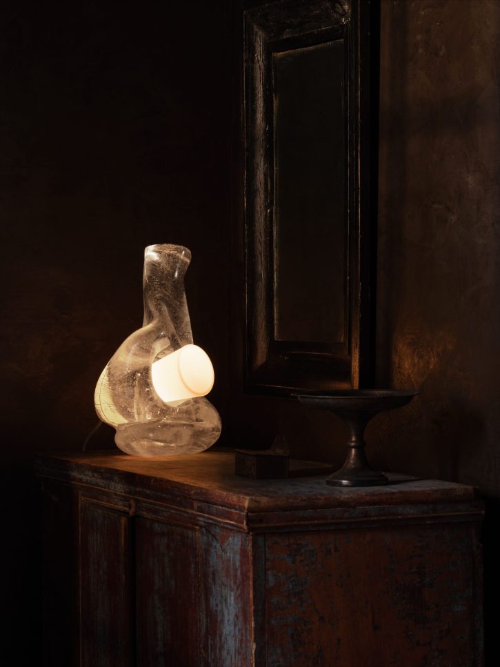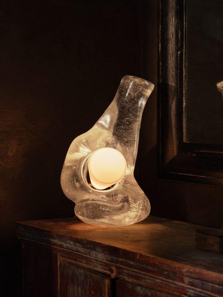 Crystal clear molten glass is poured into a graphite mold to create the sculptural body of the the lamp, which is pierced by a hand-blown white glass cone and mounted to a bronze armature.