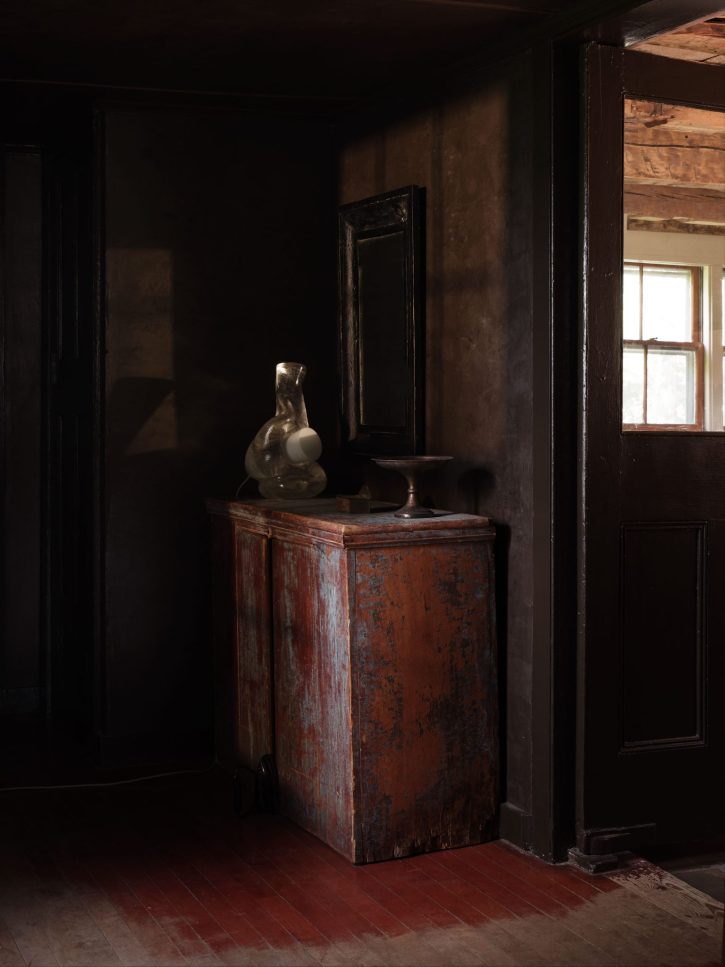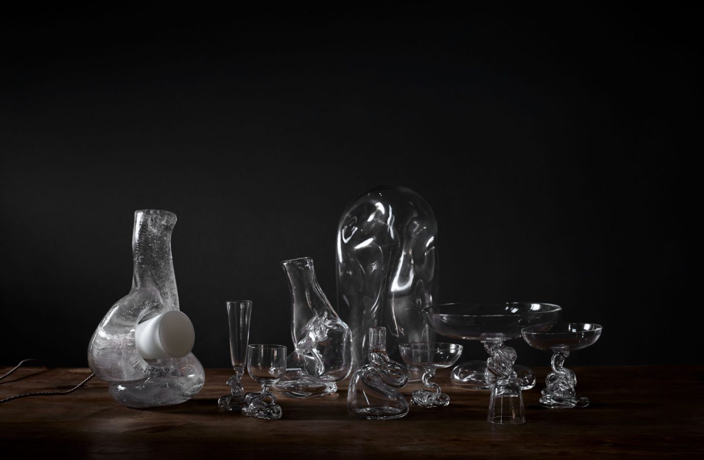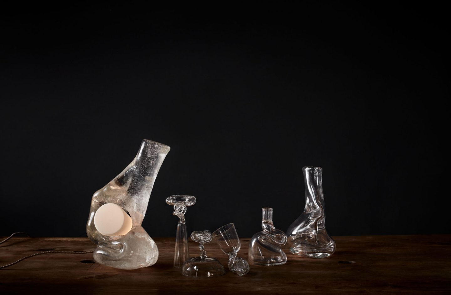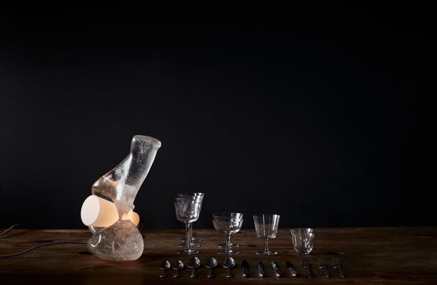 Crystal clear molten glass is poured into a graphite mold to create the sculptural body of the the lamp, which is pierced by a hand-blown white glass cone and mounted to a bronze armature.