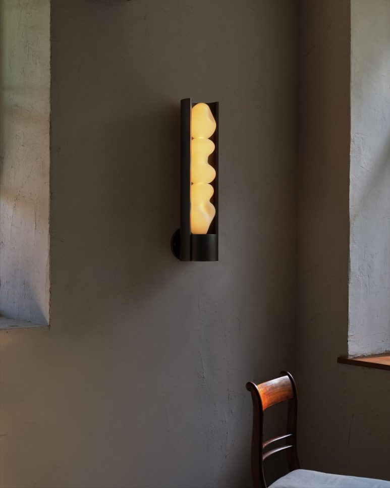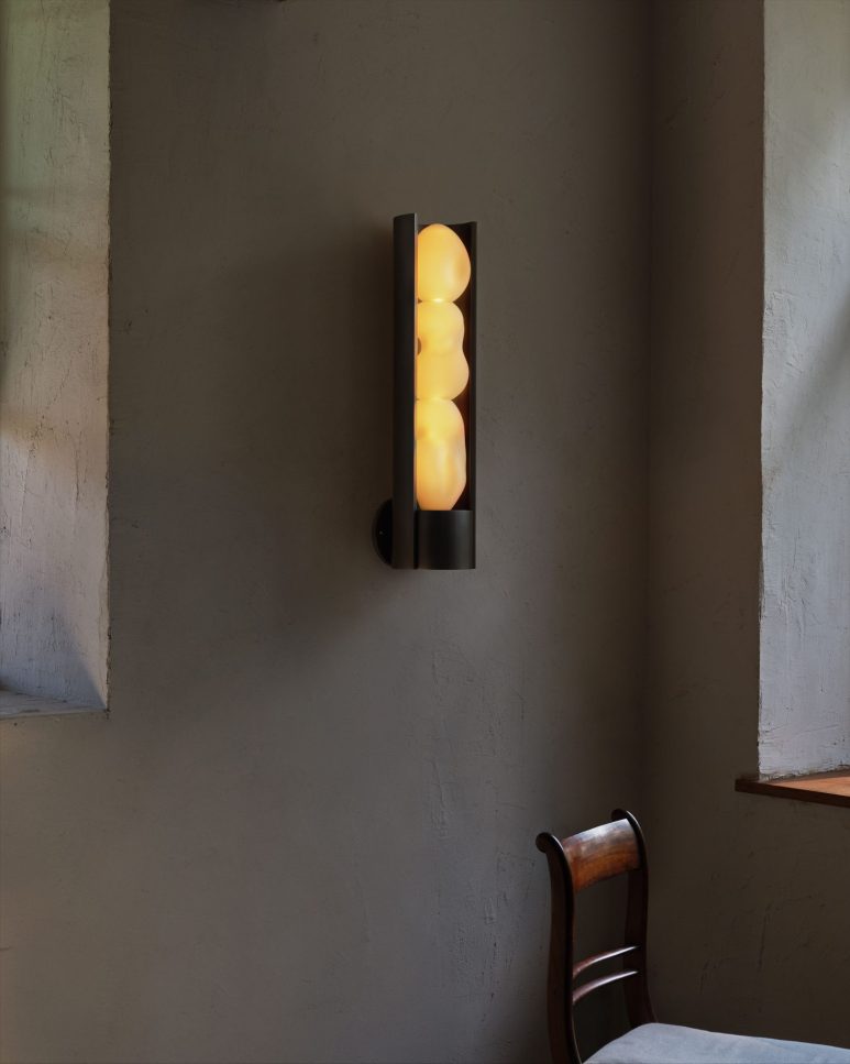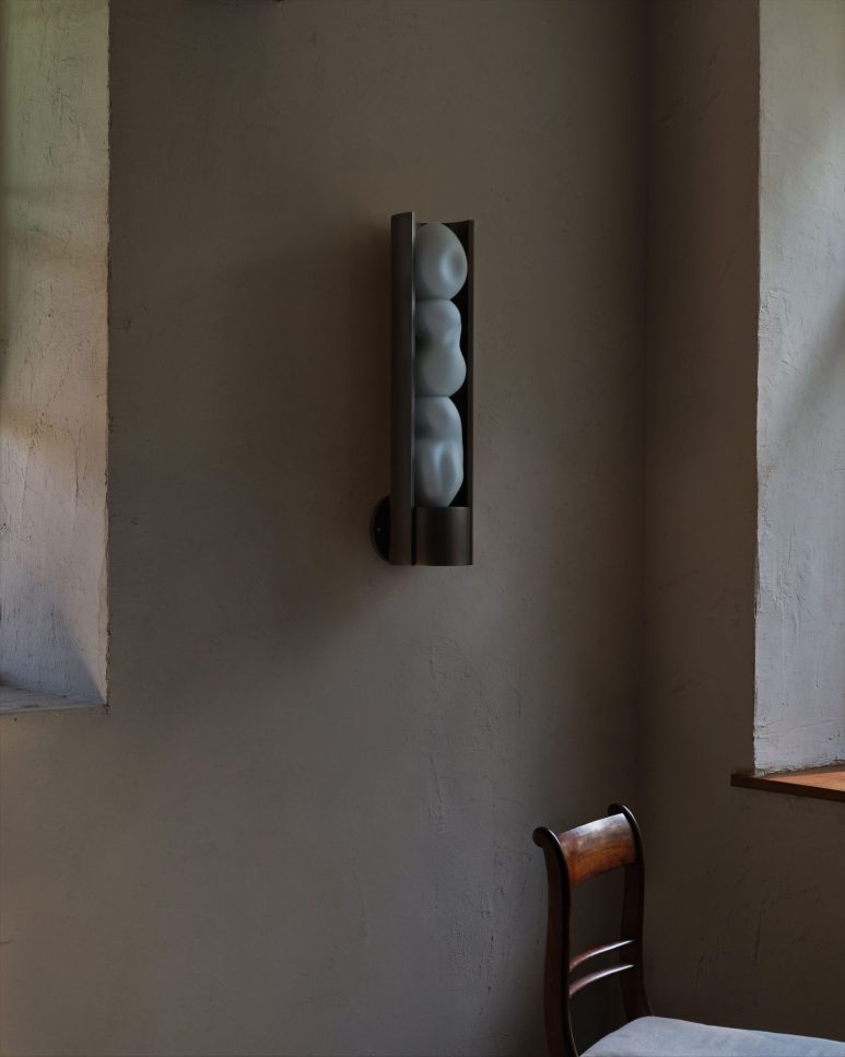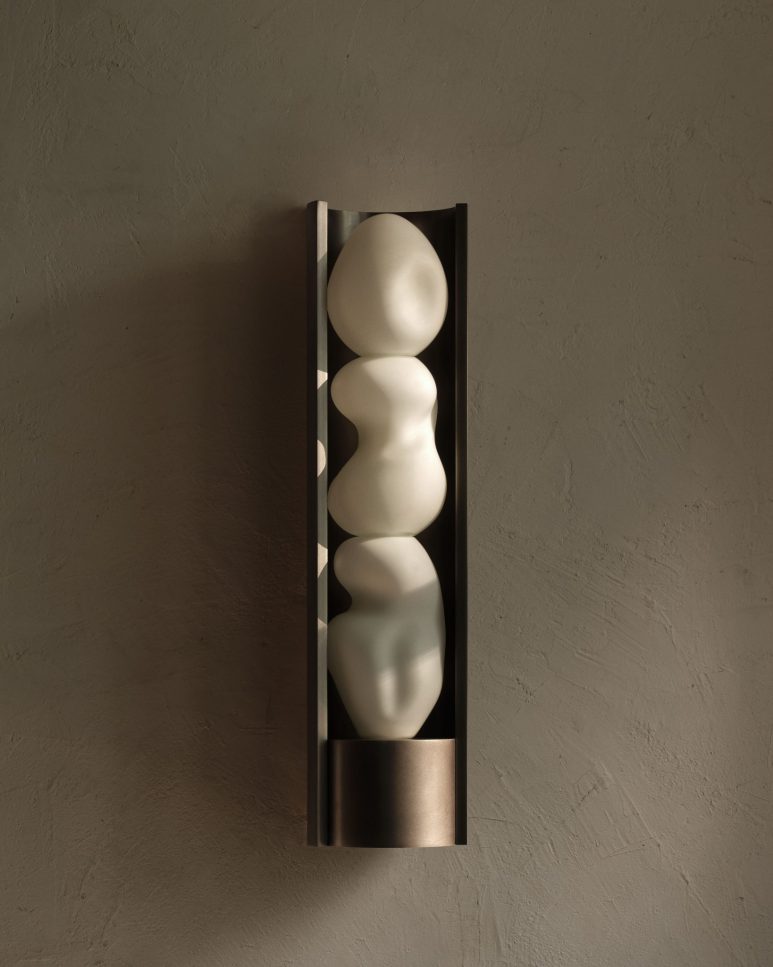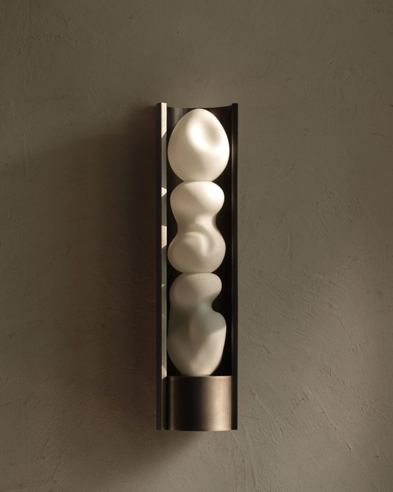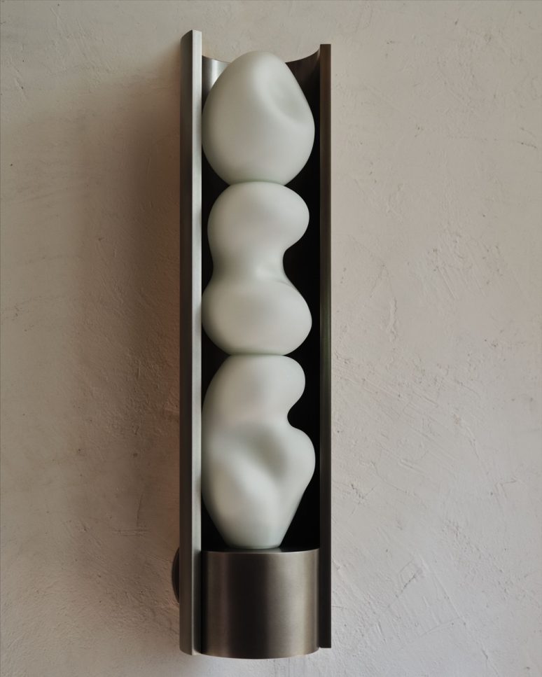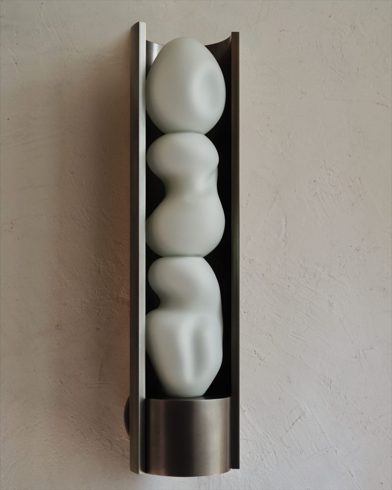 A stack of three organic blown glass forms, held within a tube of patinated aluminum. The glass can be rotated 180 degrees to created left- and right-handed configurations.