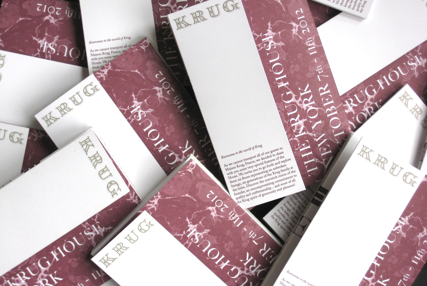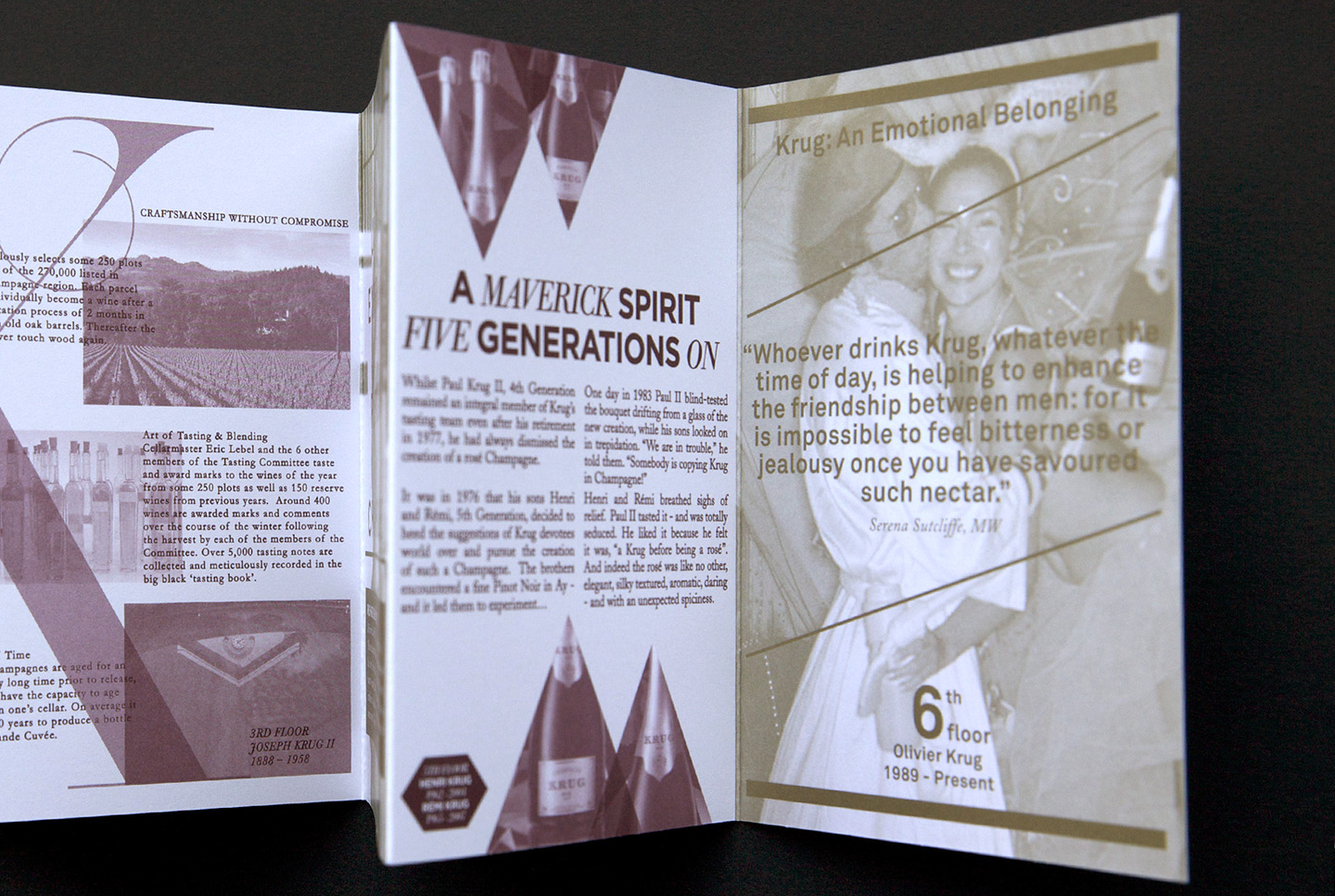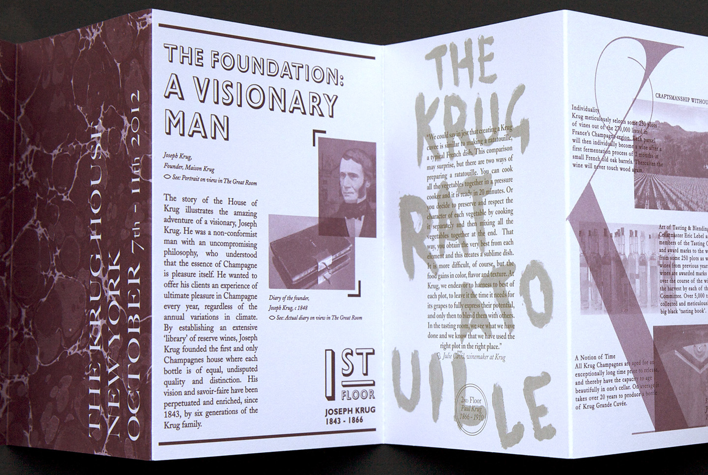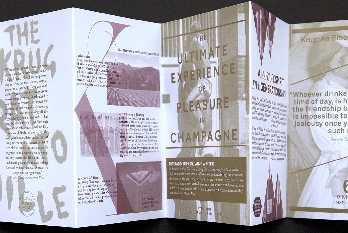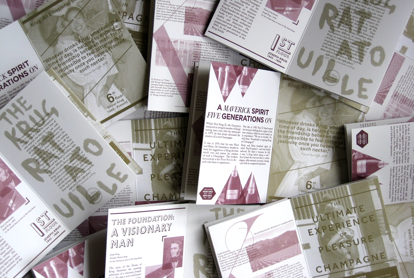 The week consisted of tastings, dinners and evening events. Guests were also treated to an exhibition of the brand’s history including rare gems from the Maison Krug archives. They asked for a printed piece that communicated the history behind the objects in the house and the adventurous spirit of the brand.