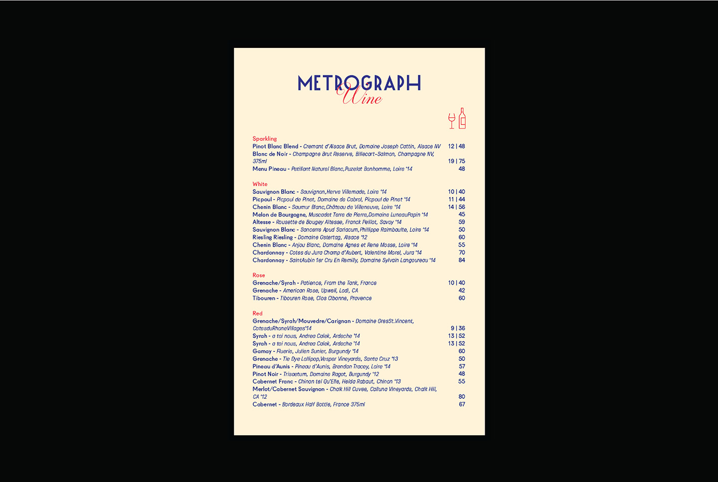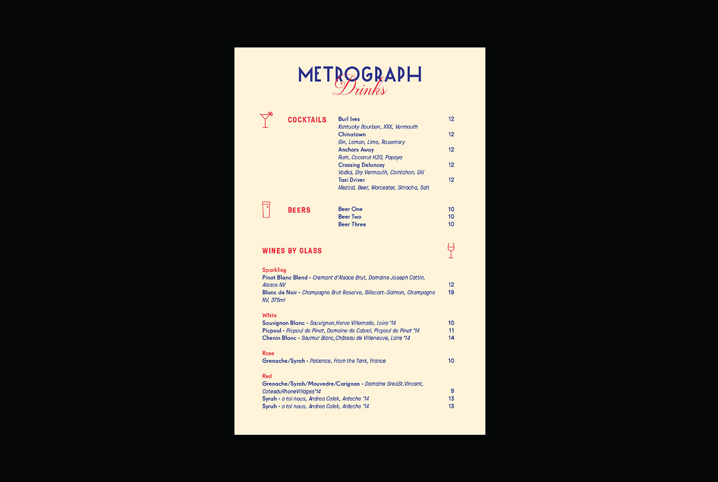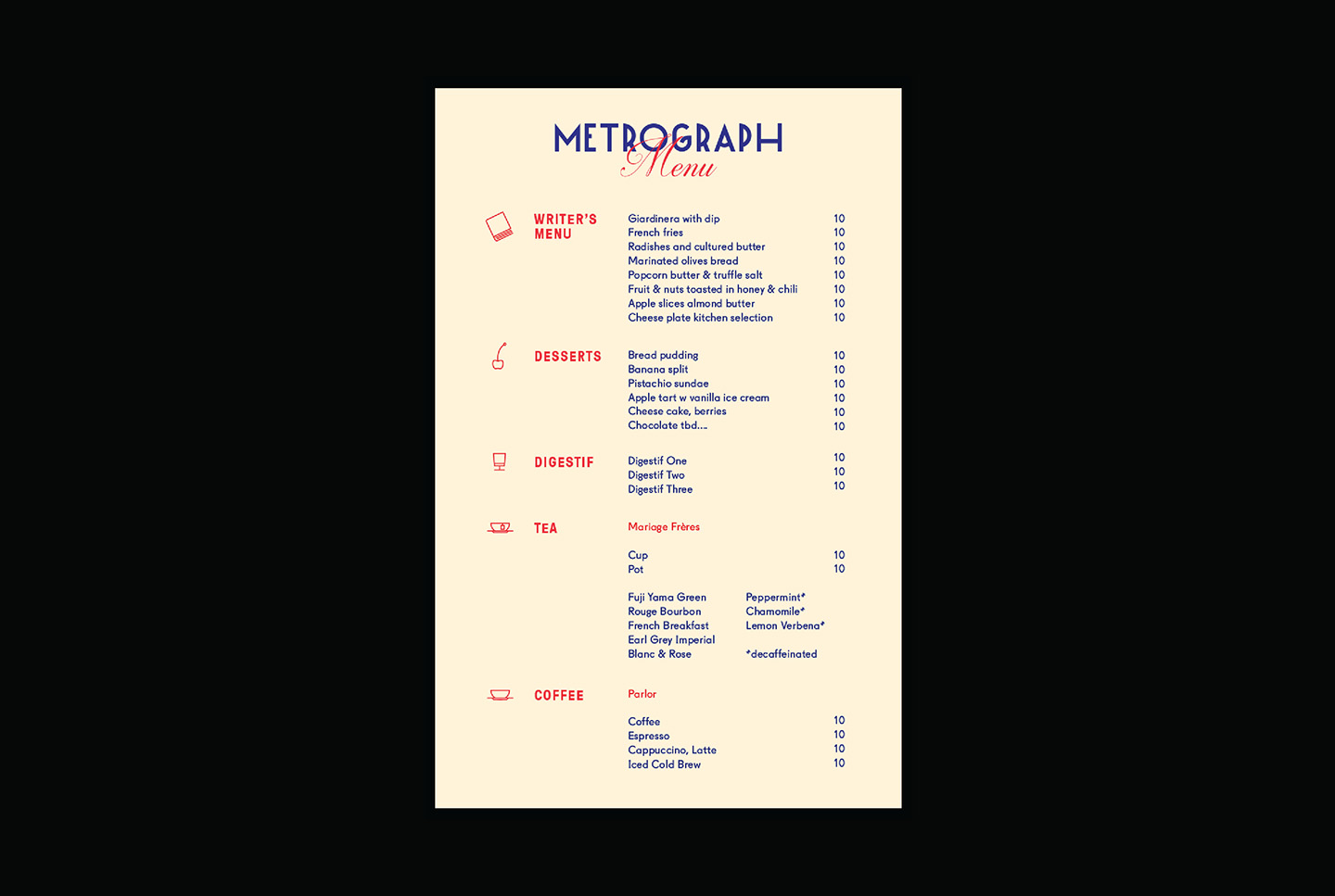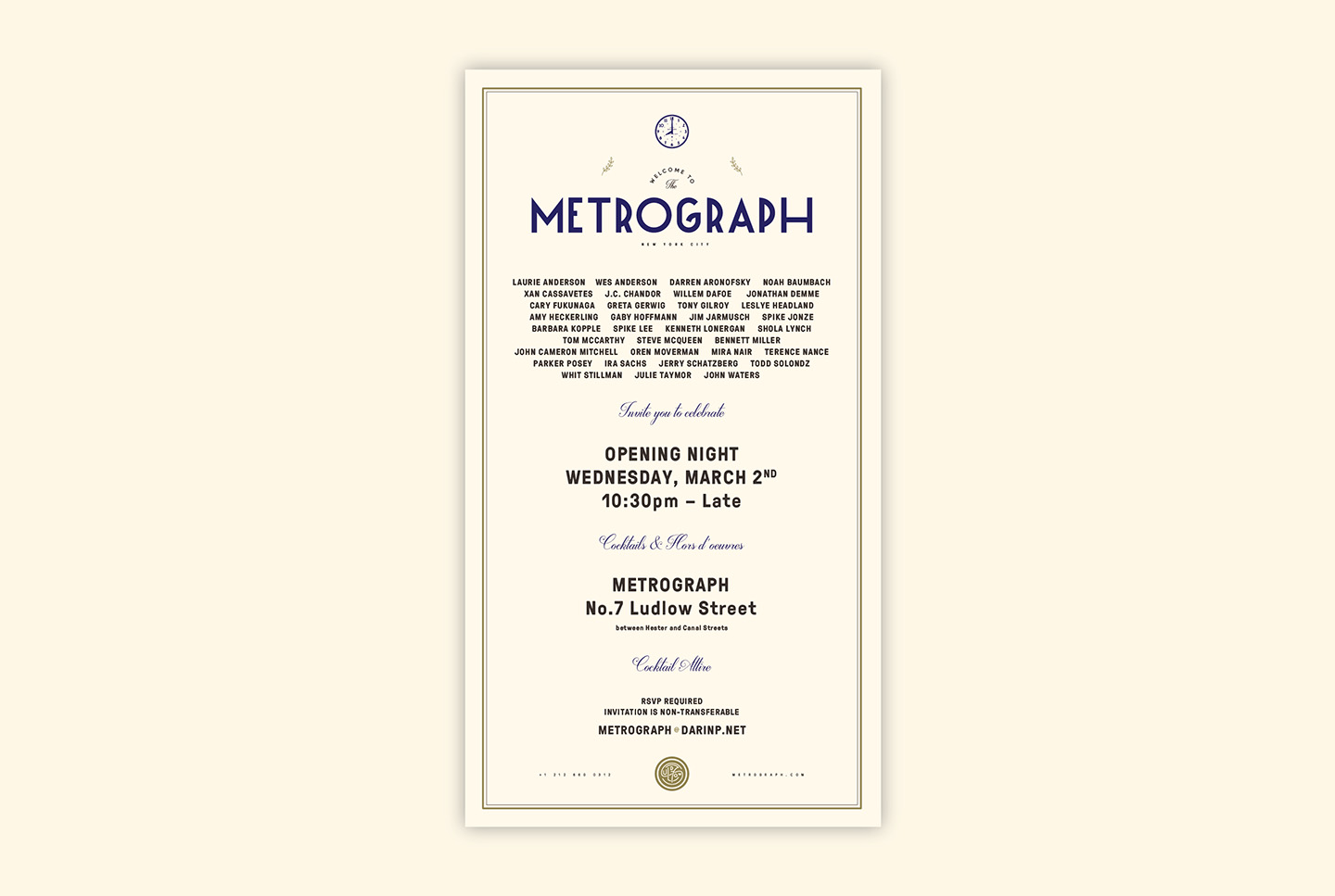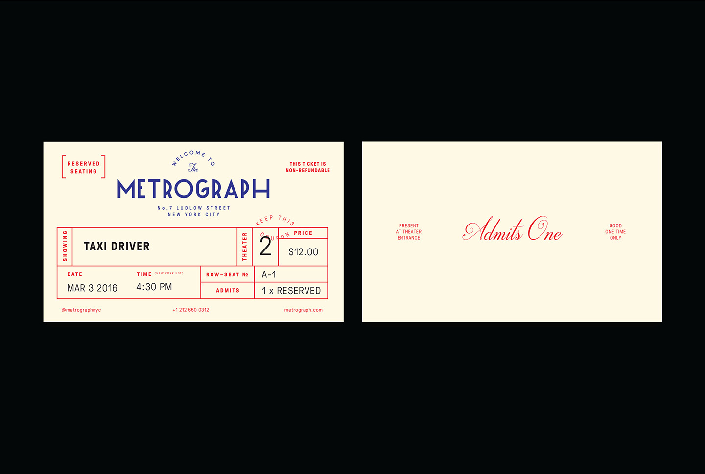 We crafted a deco inspired identity and custom typeface, harking back to the golden age of cinema, for Metrograph in the Lower East Side of New York City, an art house specializing in 35mm film. The brand extended from tickets, popcorn containers and program booklets to way finding & infographics, across the cinema, restaurant, lounge, bookstore and candy shop.