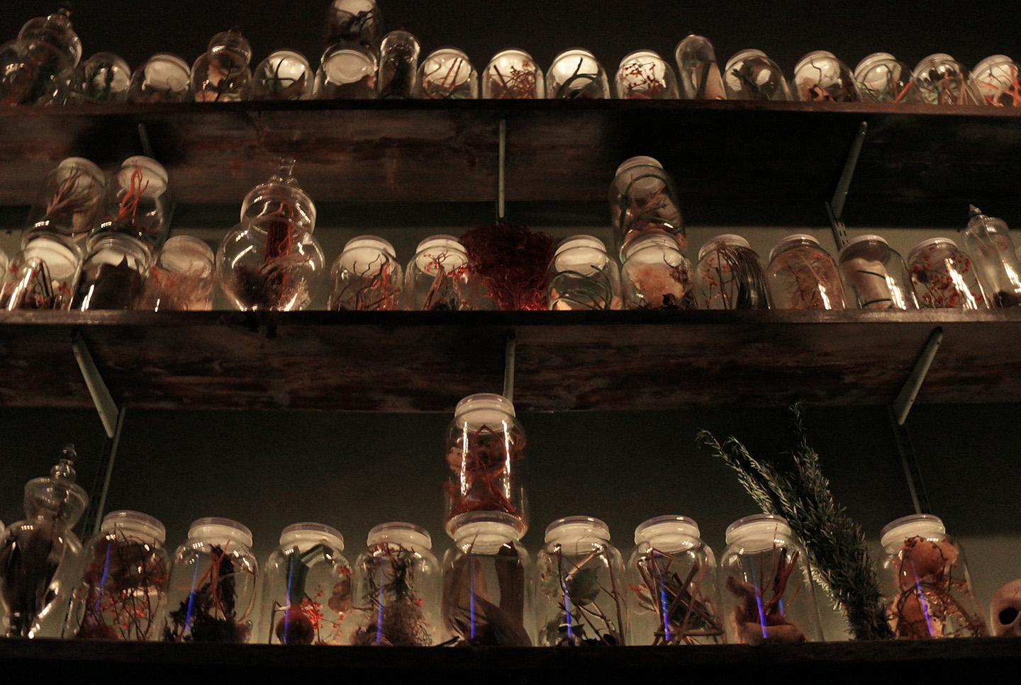 We transformed Soho Grand Club Room into a ‘Mad Apothecary’ for the weekend. The bar became a bubbling experiment lab and the main room an ominous apothecary. The space was lined with hundred of jars each with it’s own custom concoction of herbal remedies including rare seaweeds and chicken feet. Giant sage bunches hung from the ceiling and walls to ward of evil spirits.