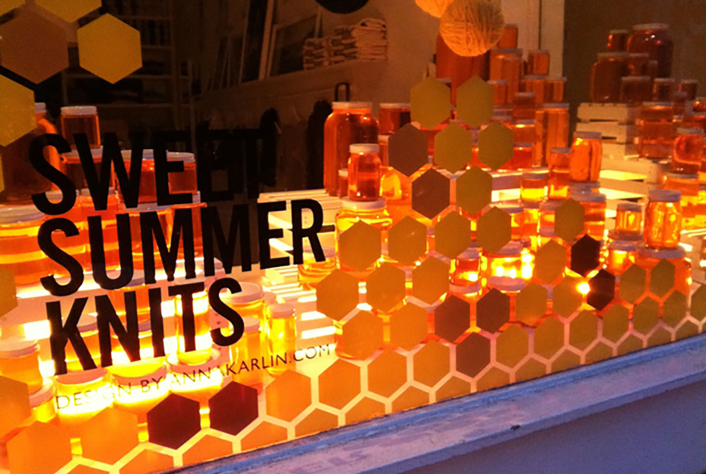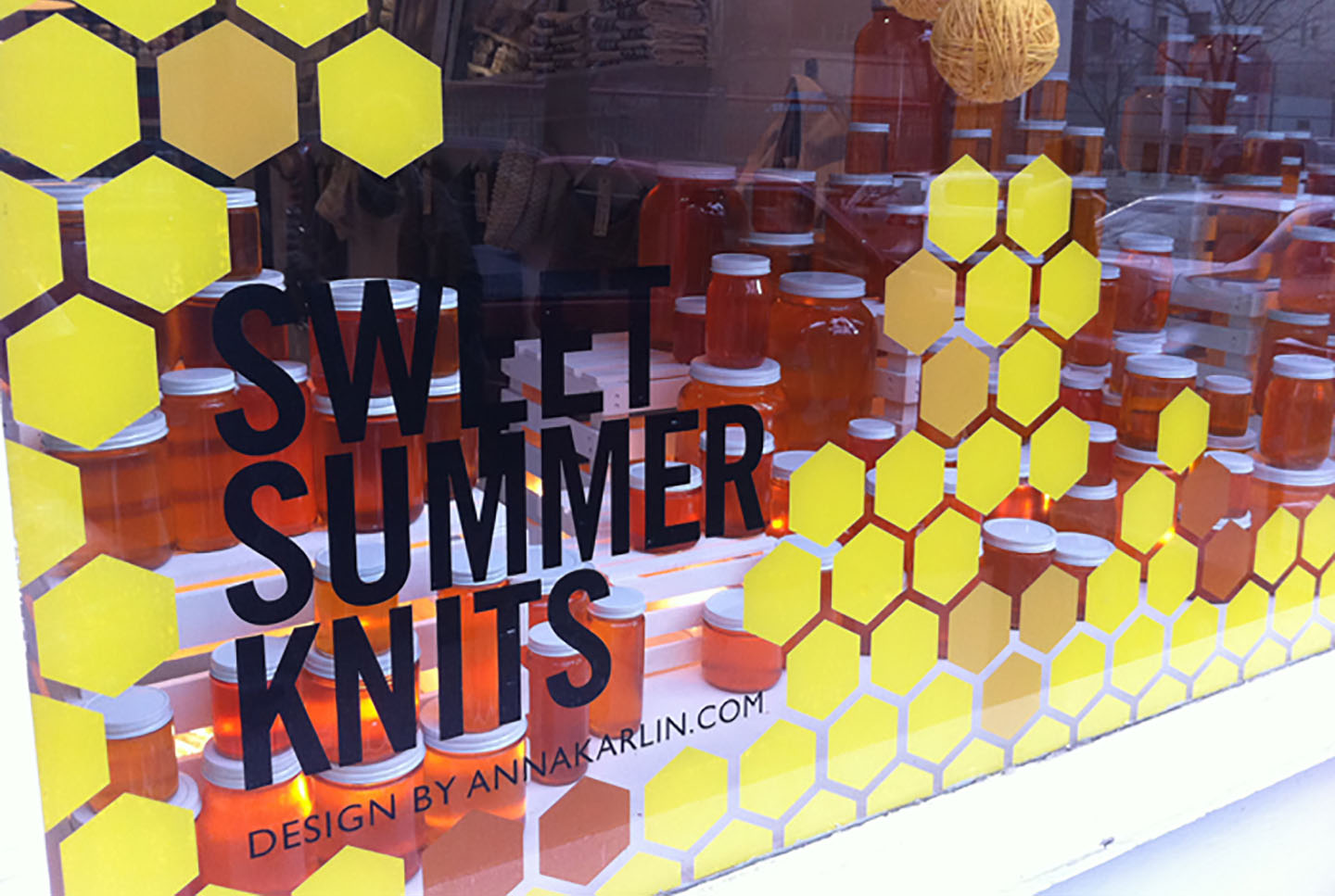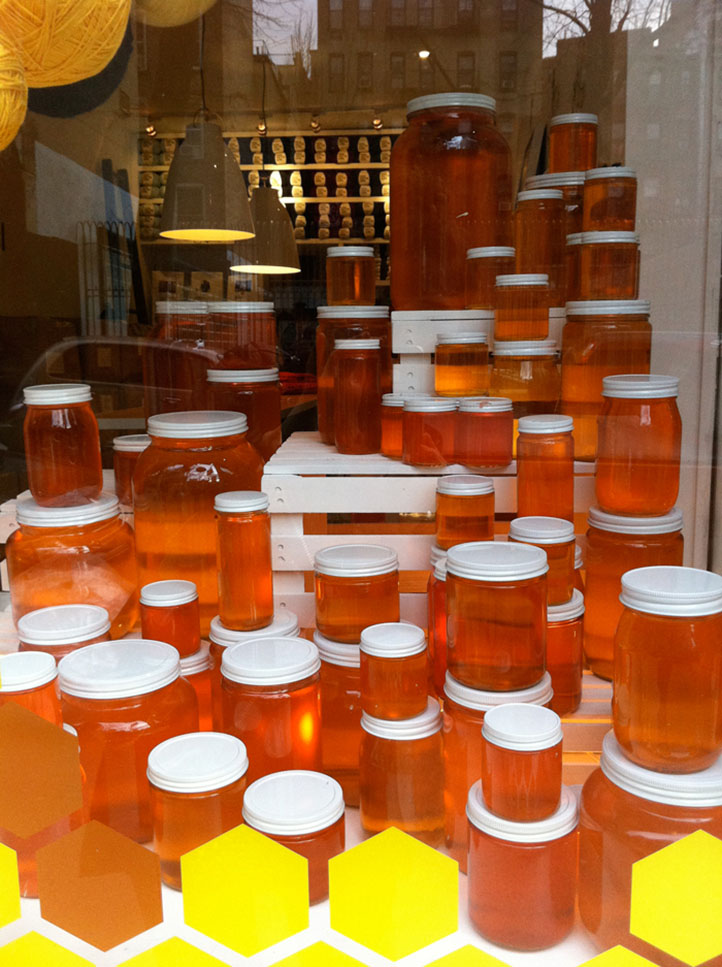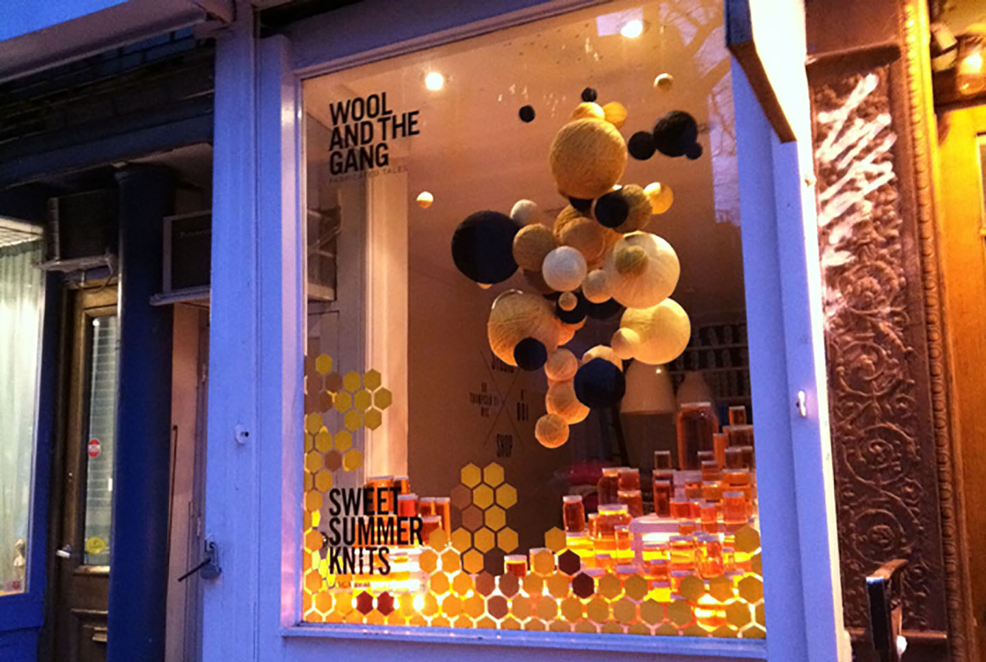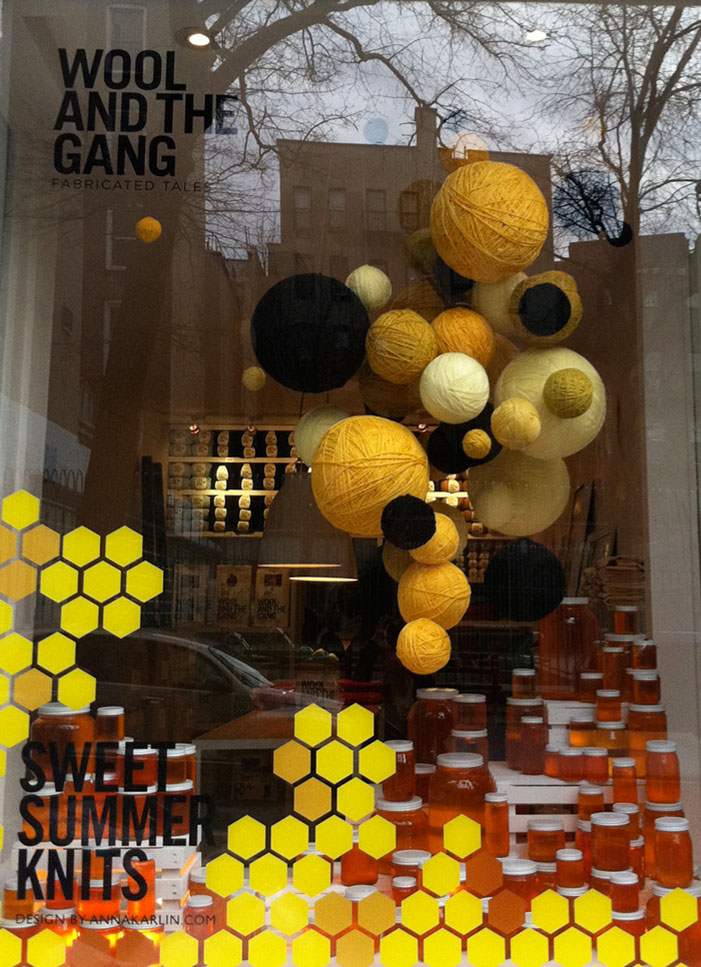 To mark the arrival of the summer collection at Wool And The Gang’s New York HQ we created a window display of glowing honey pots and a swarm of suspended wool.